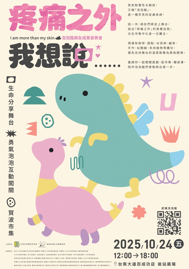為喚起社會對罕見疾病「泡泡龍」病友的理解與關懷,台灣泡泡龍病友協會與南無南漫生活實驗基地攜手,將於 10月24日(星期五)下午2點至6點,在台南大遠百成功店後站廣場舉辦「泡泡龍病友成果發表活動——《疼痛之外,我想說……》」公益活動。