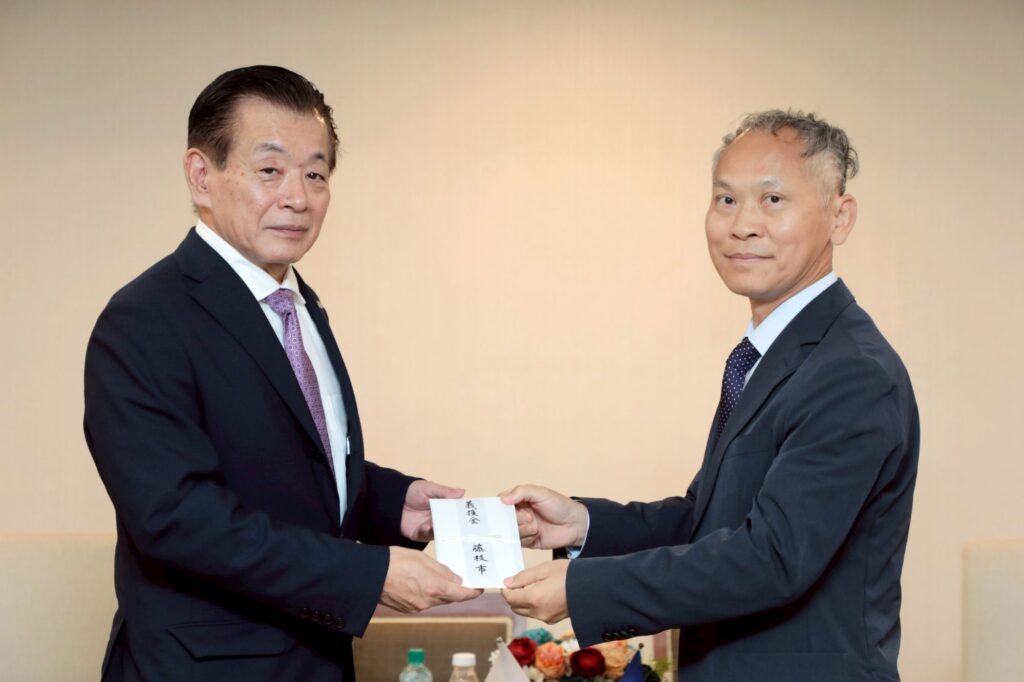 靜岡縣藤枝市於台南丹娜絲風災後發起募款賑災,今天特別帶來善款轉交,尤秘書長則代表黃市長頒發感謝狀給河野一行副市長以感謝藤枝各界對台南的關懷與援助。黃市長表示,感謝藤枝市一直致力於推動雙方實質交流,而去年藤枝東高校與台南一中簽署姊妹校後,今年也正在進行兩市多間國小學生的線上英文交流以及藤枝東高校與台南女中的交換學生計畫,非常樂見這樣學生交流更歡迎藤枝同學多來造訪,進而了解台南市跟日本之間的友誼。此外,感謝藤枝市今年五月接待台南銅雀足球俱樂部赴當地訓練及比賽,加上藤枝市目前正籌備「藤枝陶藝村」,衷心期待雙方在觀光、文化、體育方面有更多交流與合作。