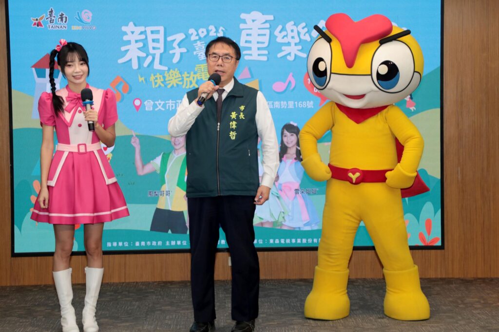台南市長黃偉哲與東森幼幼台櫻桃姐姐共同出席親子童樂會宣傳記者會,邀請市民攜家帶眷共度快樂假日。