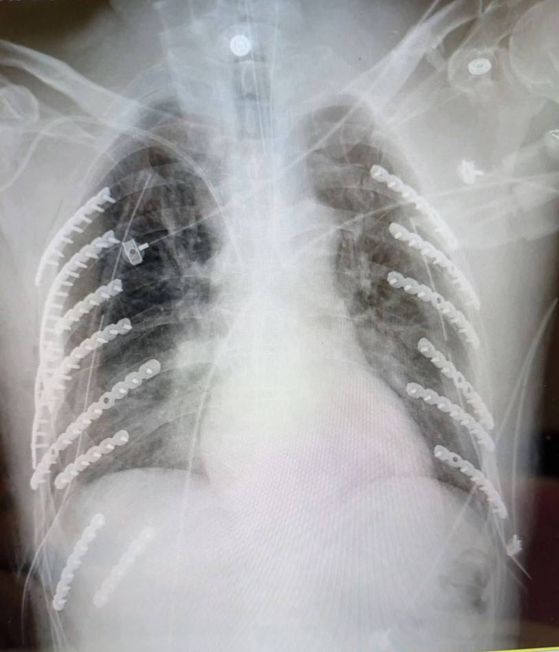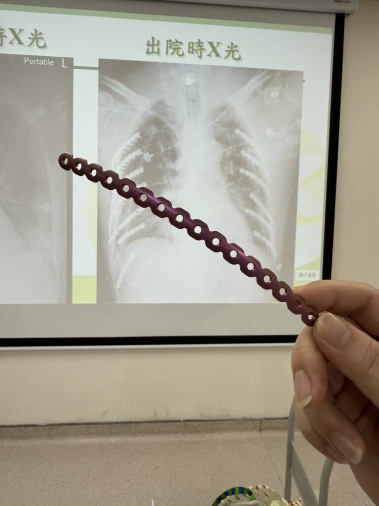 斷裂肋骨數量雖多,幸好未穿刺血管,在加護病房評估生命跡象穩定後,決定分兩階段手術。何蕙如醫師說,第一次植入八根、第二次植入六根鈦合金鋼骨,使肋骨復位固定,術後患者恢復良好,住院三周順利自己走著出院。他還自嘲身上十四根鈦合金,從此變成「鋼鐵人」,跟穿古代金鐘罩一樣厲害。