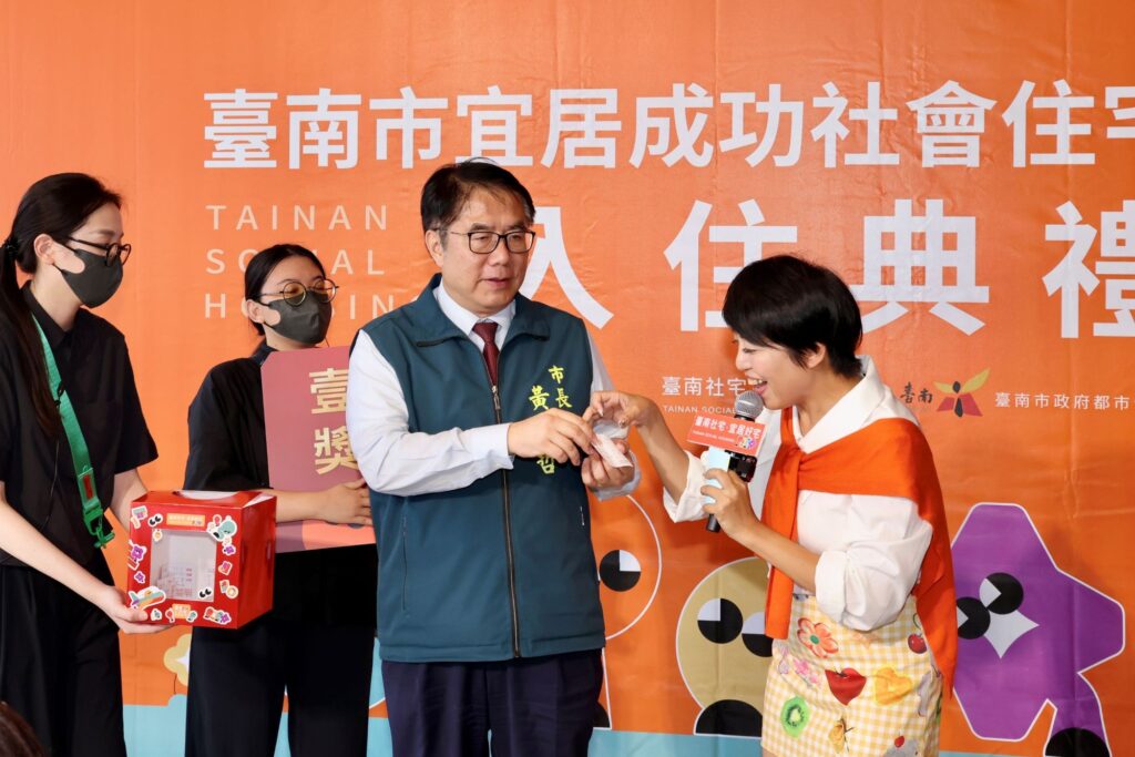 31日的入住典禮延續溫馨互動的主軸,活動現場特別安排茶飲點心及問答贈獎;市長黃偉哲向住戶獻上祝福,並致贈實用的生活好禮「推車」作為入住賀禮,隨後也抽出多份禮券,讓住戶在歡樂氣氛中滿載而歸,展現市府的貼心。