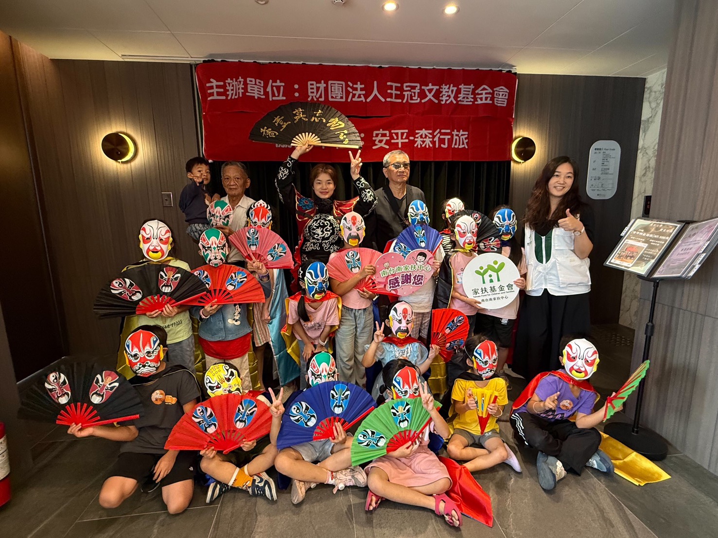 南台南家扶中心40位親子受邀前往安平森行旅飯店,參與一場別開生面的「小小變臉師—川劇文化體驗」活動。活動中,親子們不僅近距離欣賞專業川劇變臉師的精湛演出,更透過孩子的視角與無限創意,親手彩繪出充滿童趣與個人風格的面具臉譜,體驗中華傳統藝術的獨特魅力。