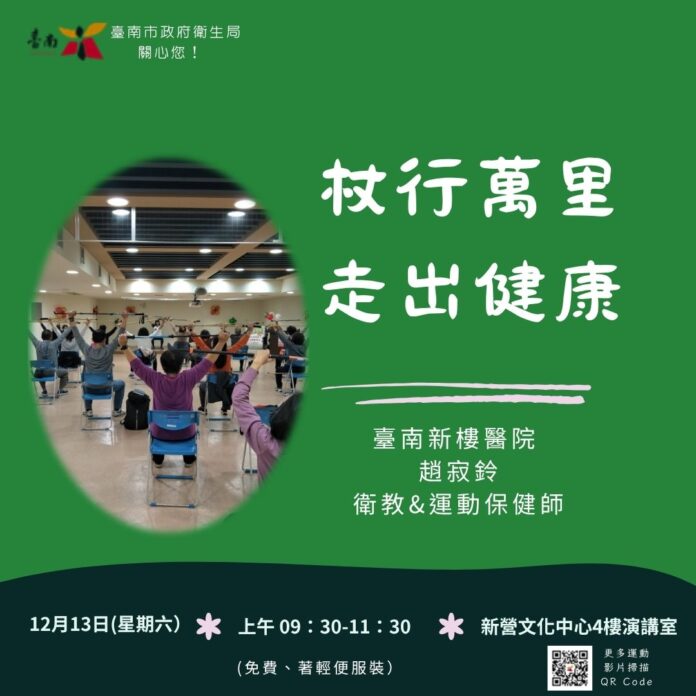 根據衛生福利部國民健康署106年訪問調查,65歲以上長者過去一年曾跌倒比例為六分之一。預防勝於治療,歲末邀請臺南新樓醫院趙寂鈴衛教及運動保健師,於12月13日星期六上午9時30分,在新營文化中心4樓演講室,辦理「杖行萬里 走出健康」講座活動,現場一起來運動及獲取健康資訊。透過健走杖輔助,建立心肺耐力與肌耐力,避免肌少症與跌倒風險,讓長者擁有良好體能,健康老化。