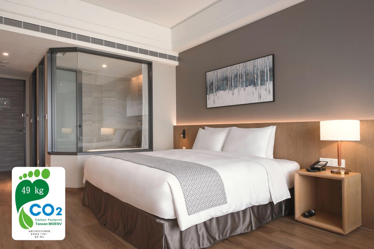 林國華局長補充說明,禧榕軒大飯店取得的碳足跡標籤,係根據環境部制定的產品類別規則PCR 21-028進行活動數據之蒐集,以住宿服務的生命週期為範籌,涵蓋備品、耗材及清潔用品等原料取得、住房前準備、住宿使用、清潔等服務,以及廢棄物處理等,計算溫室氣體排放,並以二氧化碳當量呈現,後續還要經第三方嚴謹查證。因此取得碳足跡標籤的意義及難度重大,目前全國僅有4家旅宿業取得碳足跡標籤,禧榕軒大飯店成為雲嘉南地區首家取得的業者,充分彰顯市府永續觀光政策推動的豐碩成果。林國華局長期盼藉由禧榕軒大飯店的成功案例,帶動其他旅宿業良性競爭,攜手邁向永續發展。