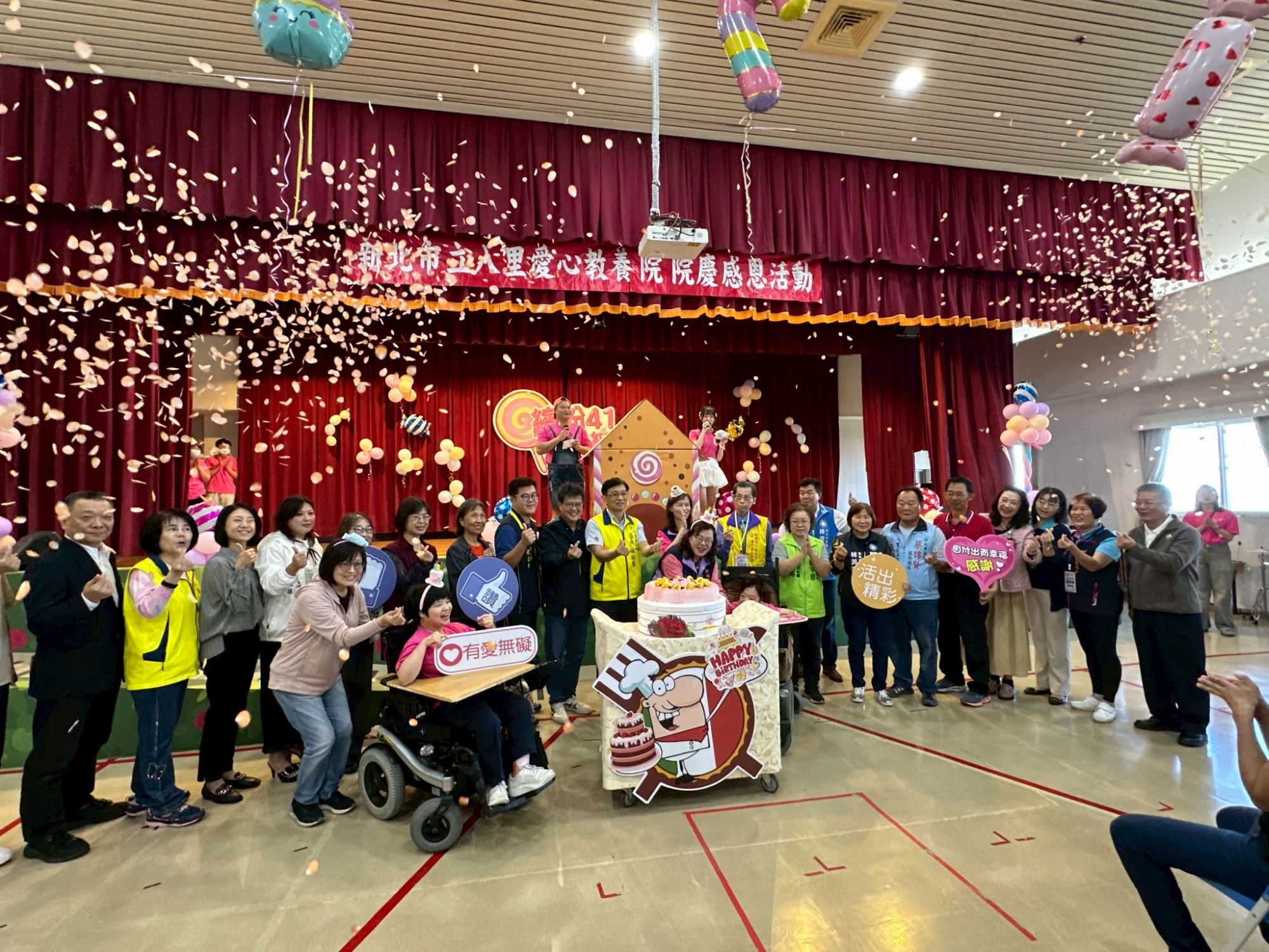 八里愛心教養院院長劉文湘表示,今年院慶以糖果屋派對為主題,讓院生共享美食與歡樂。感謝八里區長林銚傑、民代助理、各社團、社區理事長、志工團隊等蒞臨支持,以及同仁專業的照護,讓院生生活增添繽紛色彩。