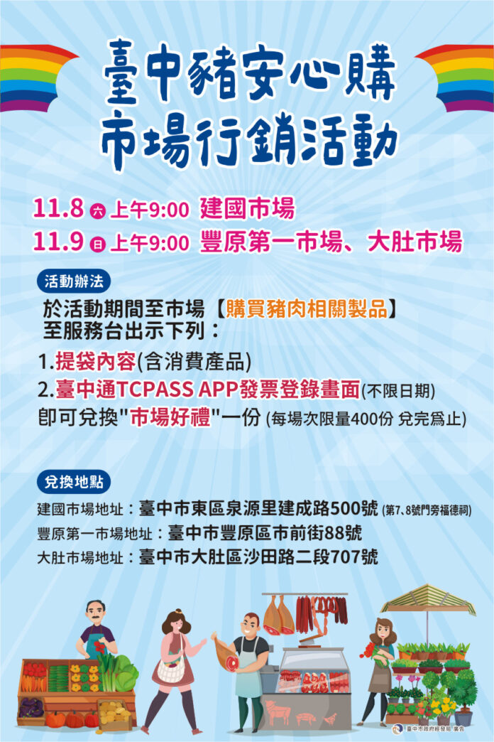 挺豬肉、挺攤商!隨著非洲豬瘟防疫禁令解除,豬肉批發、拍賣及屠宰作業恢復運行。台中市政府經濟發展局積極展開振興行動,將於8日起在建國、大肚、豐原第一與東興市場推出四波「台中豬安心購 市場接力送」活動,只要到指定市場消費、拎購買物,並出示購物節APP發票紀錄之畫面,即享近3,000份肉鬆、肉乾、肉條、肉排等好豬味免費領,盼攜手市場攤商共度疫後挑戰,帶動買氣重回市場。