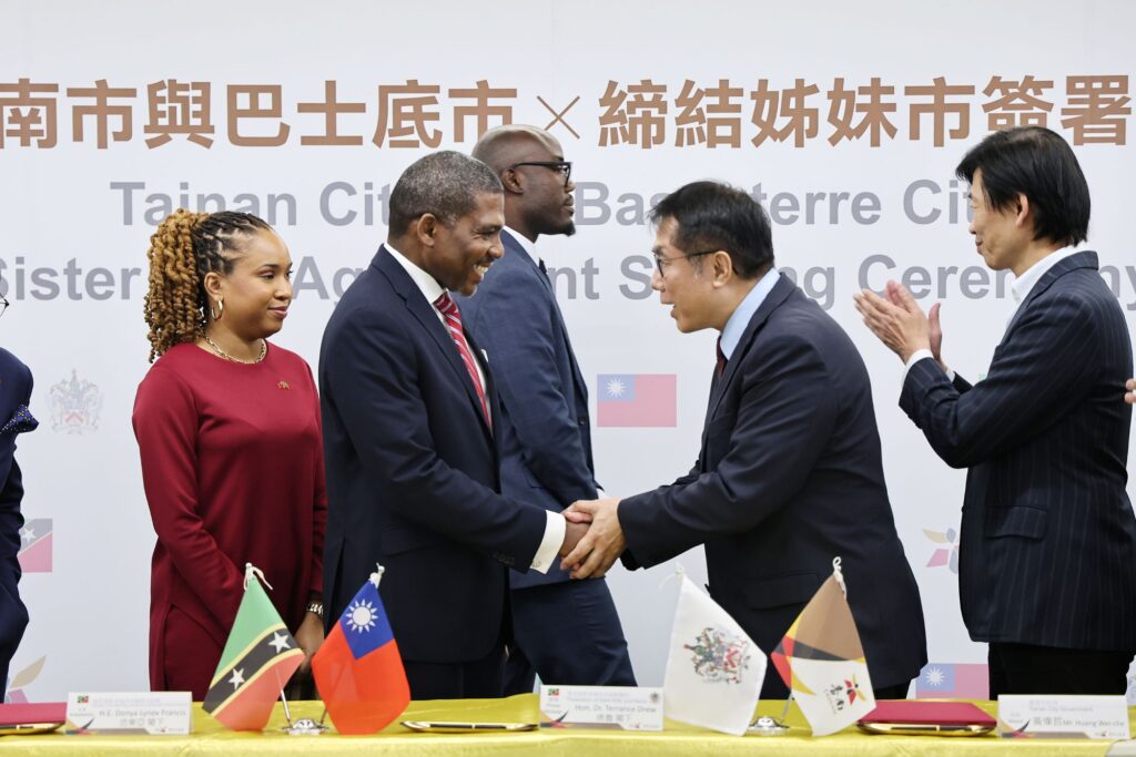 邦交國聖克里斯多福及尼維斯聯邦總理德魯(Terrance Drew)14日與總理夫人普琳絲(Diani Prince-Drew)率團到訪台南,黃偉哲市長偕葉澤山副市長與多位市府局處首長熱情迎接訪團。德魯總理此行見證了該國駐台大使范東亞(H.E. Donya Lynex Francis)代表巴士底市(Basseterre City)與黃偉哲市長簽署姊妹市協定。