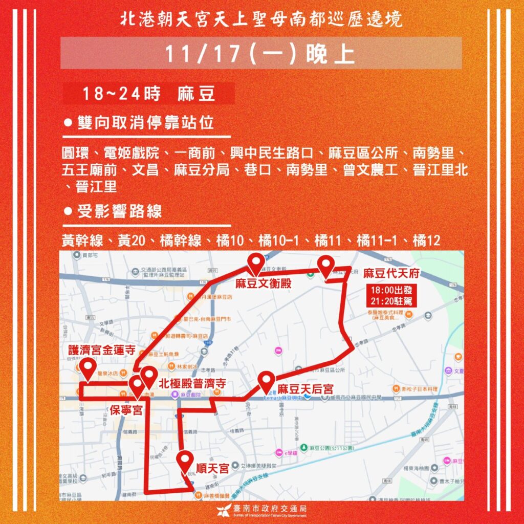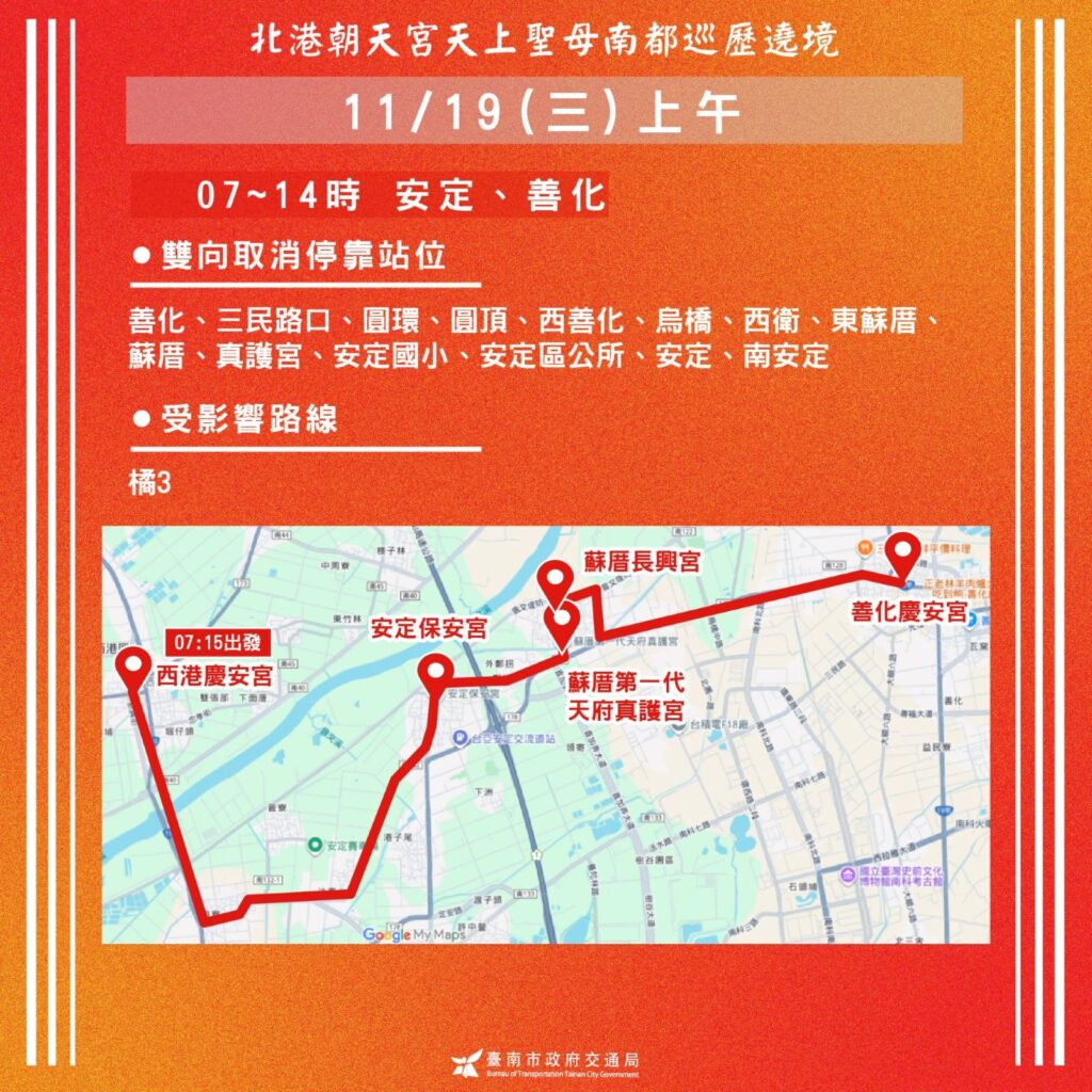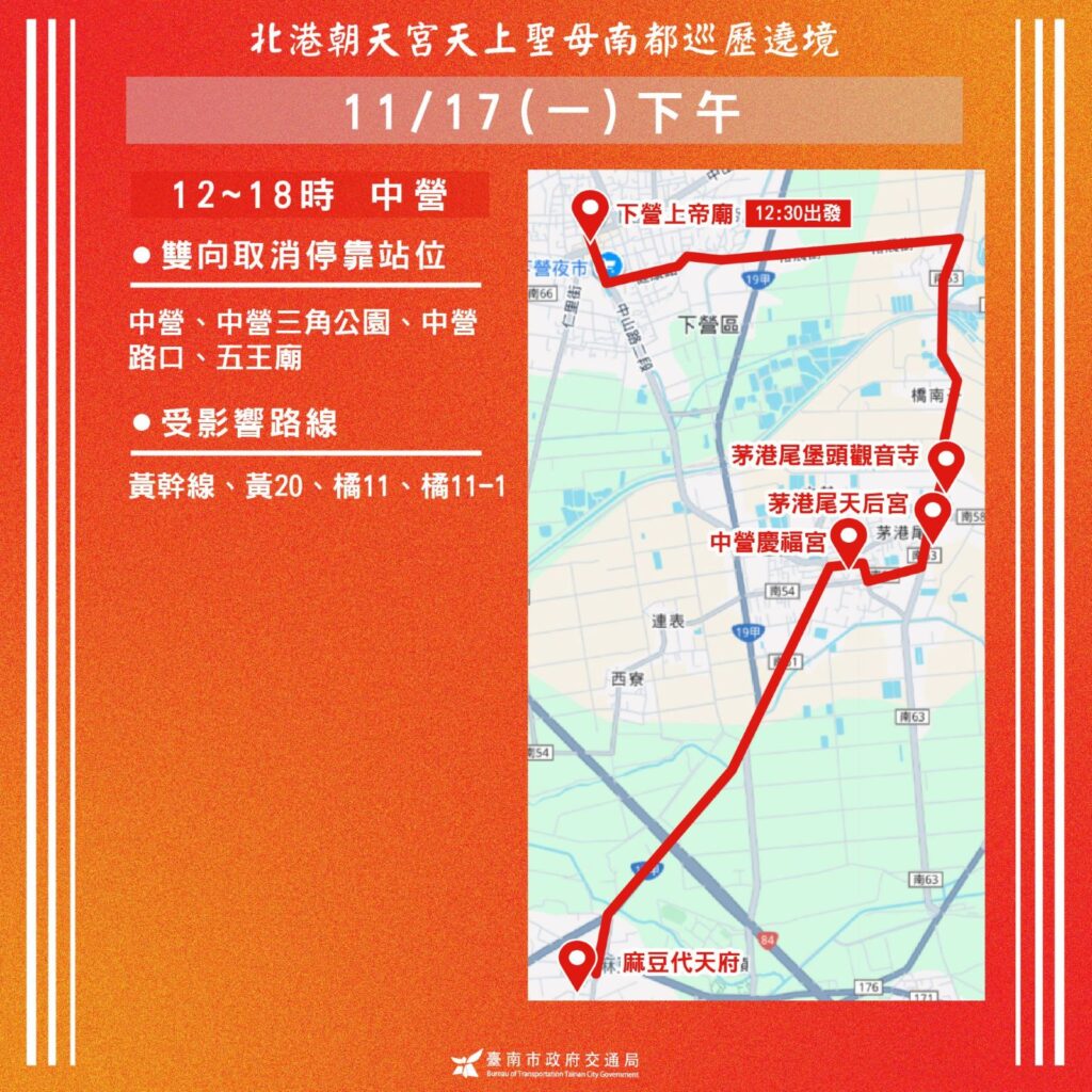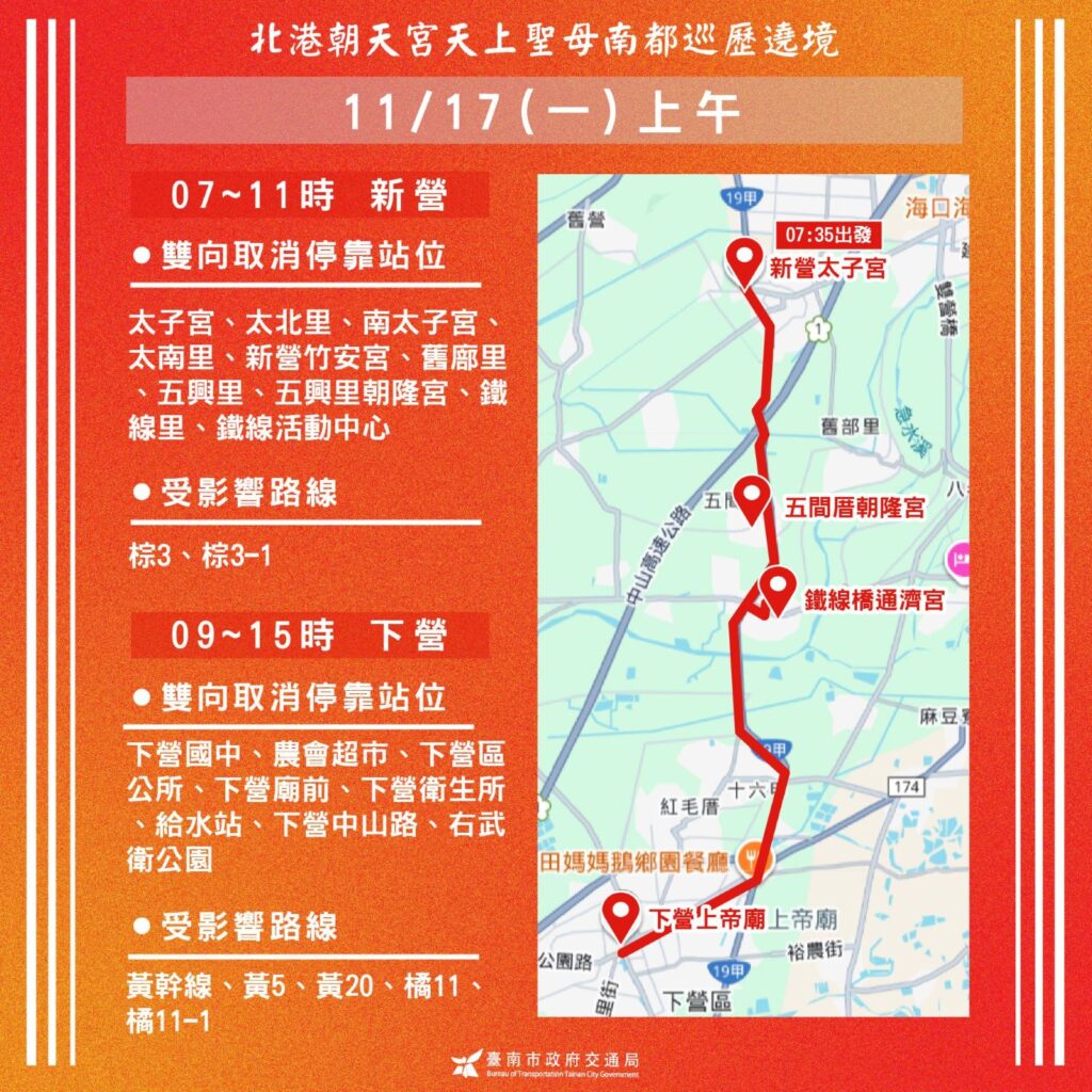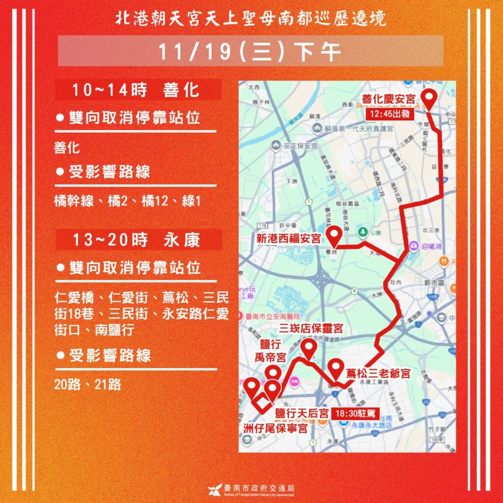 遶境期間南市公車配合調整營運路線及取消停靠站位,16日影響鹽水與新營區、17日下營與麻豆區、18日麻豆、佳里、西港區、19日安定、善化、新市、永康區,欲搭乘公車民眾事前可至「大台南公車」網站或APP查詢詳細管制公告,當天乘車前建議於「大台南公車APP」查詢各路線交管不停靠動態資訊,以免耽誤寶貴時間。