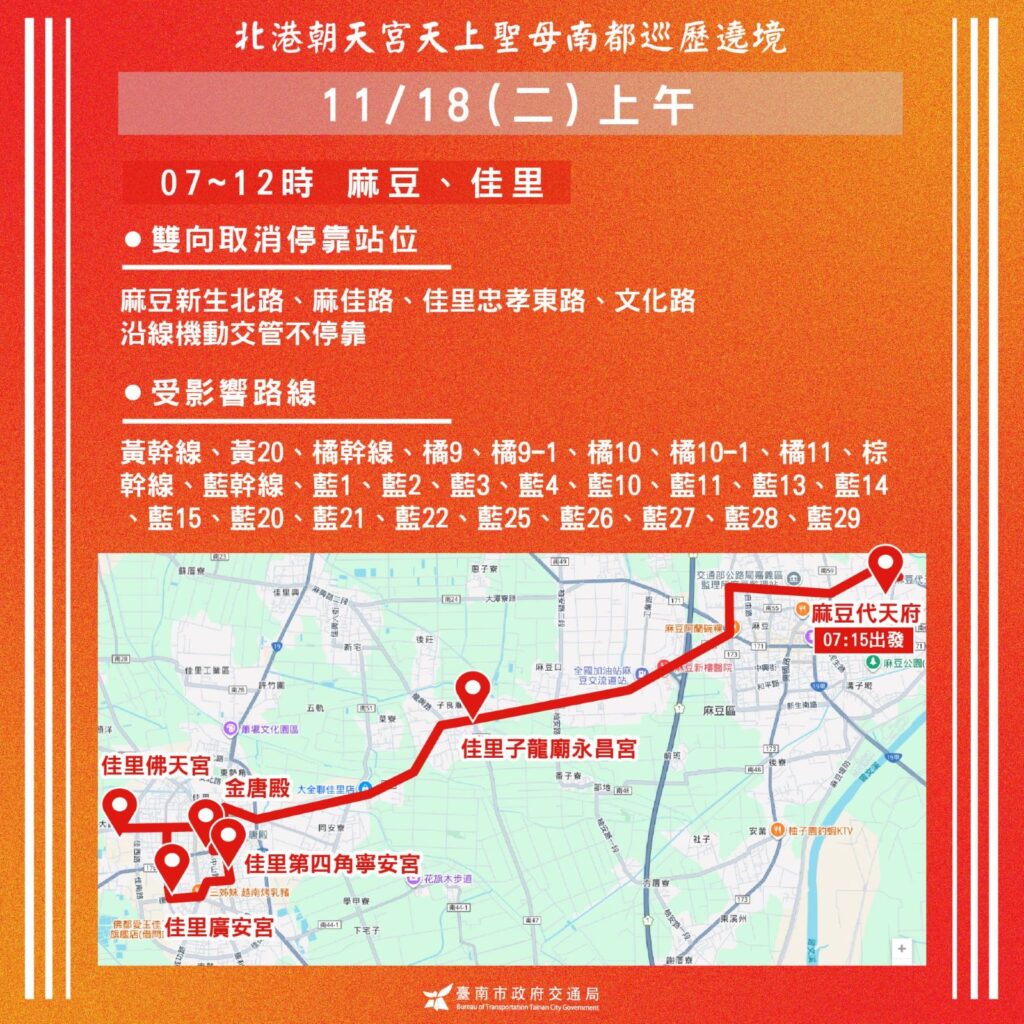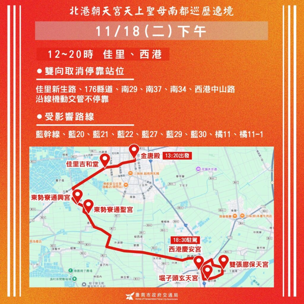 本月16日至23日將有為期8天的「2025乙巳年北港朝天宮天上聖母南都巡歷」活動,遶境路線將由鹽水區開始陸續行經臺南市多個行政區,臺南市政府交通局請市民朋友提早規劃替代路線,避開可能擁擠路段,節省旅行時間。