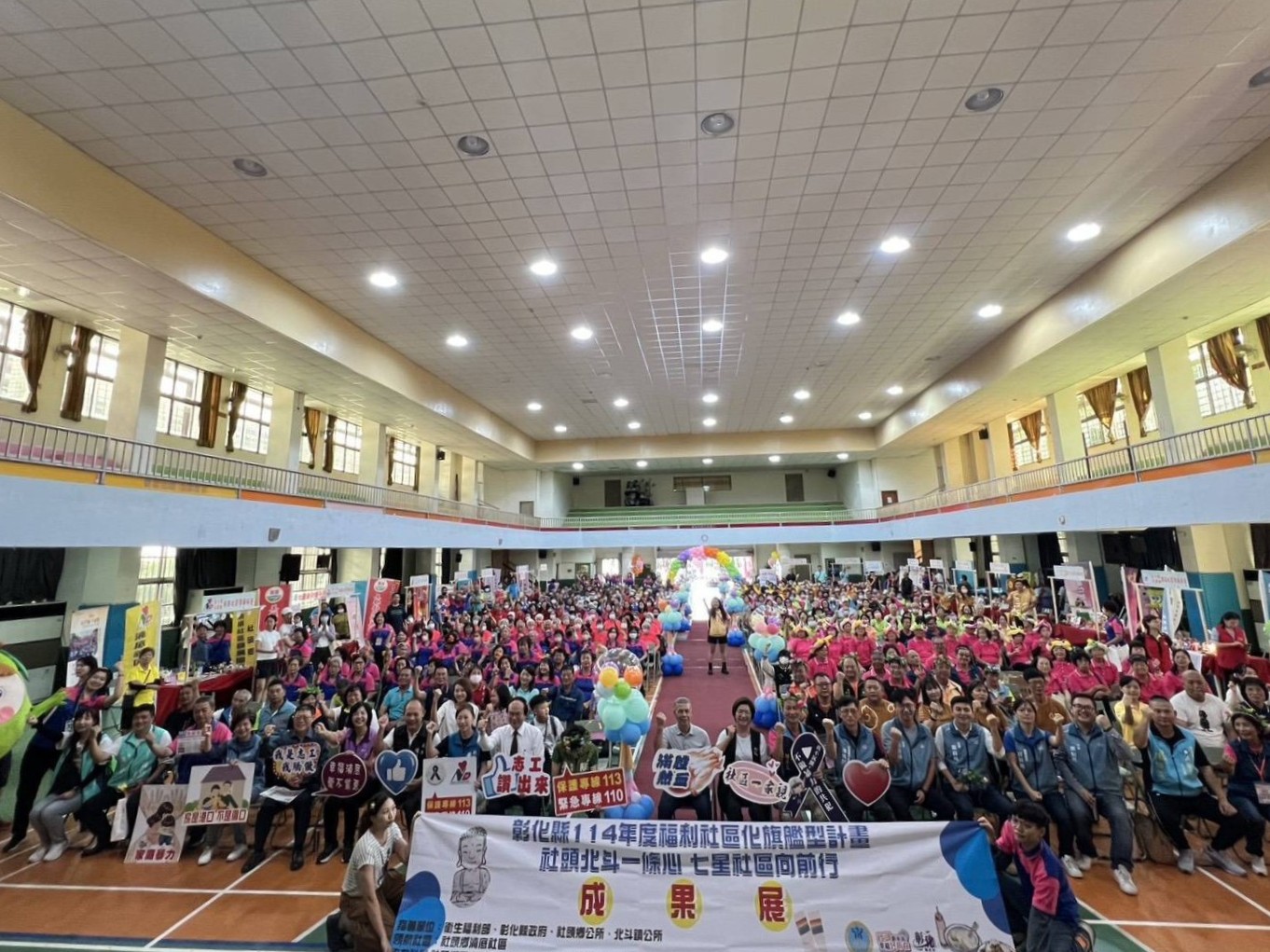 114年度彰化縣福利社區化旗艦型方案計畫-「社頭北斗一條心 七星社區向前行」成果展,16日在社頭國小活動中心舉行,縣長王惠美、社頭鄉長蕭浚二、北斗鎮長顏宏霖、各社區理事長等人與會。王縣長感謝湳底社區帶領泰安、美雅、社頭、廣福、福竹及北斗鎮居仁社區等社區一同辦理旗艦計畫方案,透過各方團隊的經驗分享,結合社區長者的動態表演及靜態展示,展現社區間共好共融的姿態,期盼未來各社區延續這股力量,繼續鬥陣向前衝!