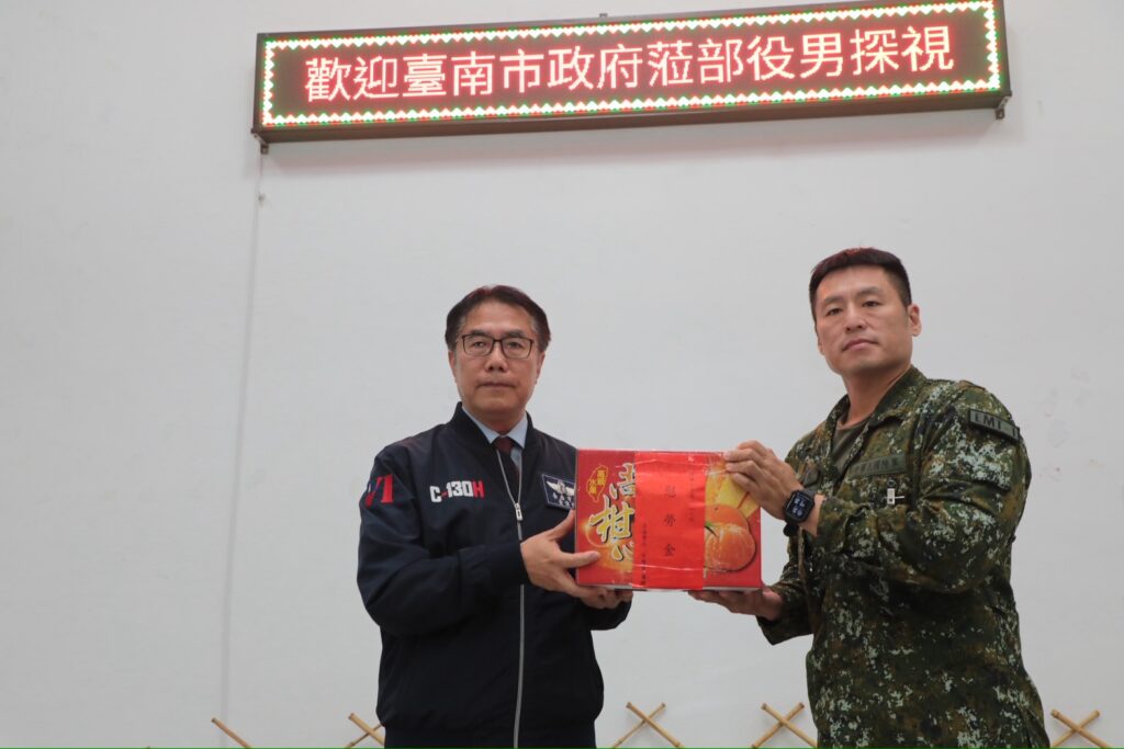 台南市長黃偉哲19日帶著滿滿的關心與加油打氣,前往陸軍步兵第137旅新化知義營區,探視正在接受新訓的台南子弟兵。黃偉哲不只親手送上慰勞金和台南好味農特產品,還加碼端出炸雞與飲料,引來役男們一陣歡呼,現場氣氛溫馨又熱鬧。