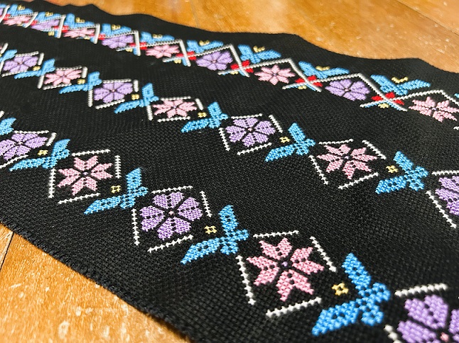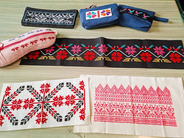 除了傳統族服上的飾條,十字繡運用於生活物件,可發展為文創商品。(張耘書拍攝)