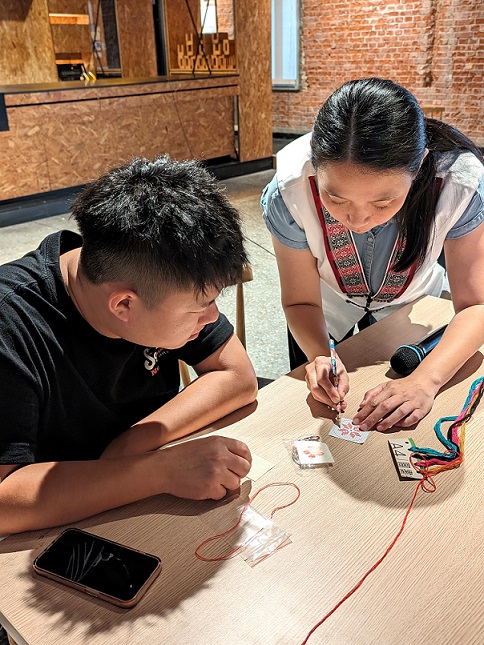 陳怡君說繡法與技術靠的是熟練,紋飾的脈絡與部落的故事才是精髓,她慢慢摸索、勤練精進外,教學時更不忘分享這些紋飾背後的意涵,而幾年下來,透過吉貝耍部落學堂的計畫與活動,部落的族人已經完成許多繡片、飾條,也將十字繡紋運用於門牌,甚至她還鼓勵族人在傳統的元素下創新發想,希望能讓西拉雅族的十字繡走向文創。而不僅十字繡,陳怡君也利用夏令營課程時,教導部落學童做串珠手環,根據部落口傳,過去婦女生產完會以苧麻繩來綁嬰兒的臍帶,等臍帶脫落後,母親會保留這條苧麻繩再與其他的苧麻混編成細繩,串玻璃珠與薏苡珠做成手環,戴在孩子手上,象徵媽媽對對孩子的守護。藉由學習捻繩串珠,不僅讓學童能從較簡易的工藝入門,也延續西拉雅族的傳統文化。
