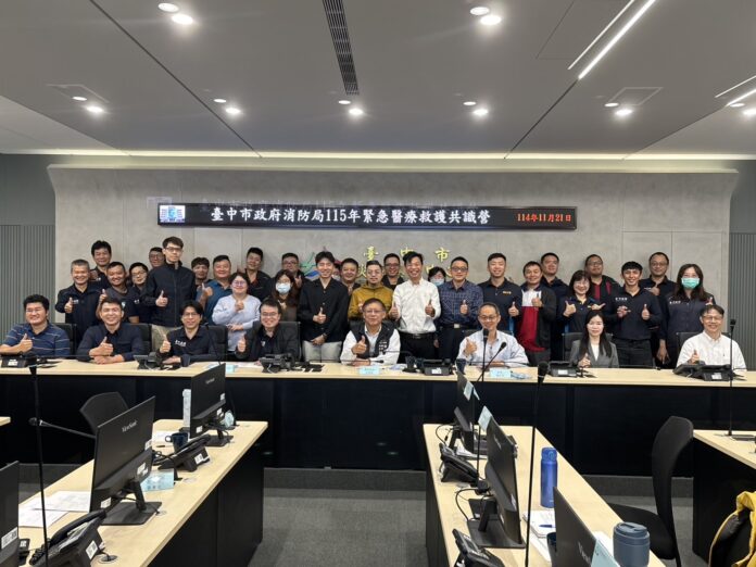 台中市政府消防局21日於災害應變指揮中心舉辦「115年度到院前緊急醫療救護共識營」,集結台中市及彰化縣、南投縣、苗栗縣四縣市救護主管及醫療指導團隊,展開跨區域EMS(Emergency Medical Services)深度交流。活動由林黎銘簡任技正全程主持,強調區域合作對提升中部整體救護量能的重要性。