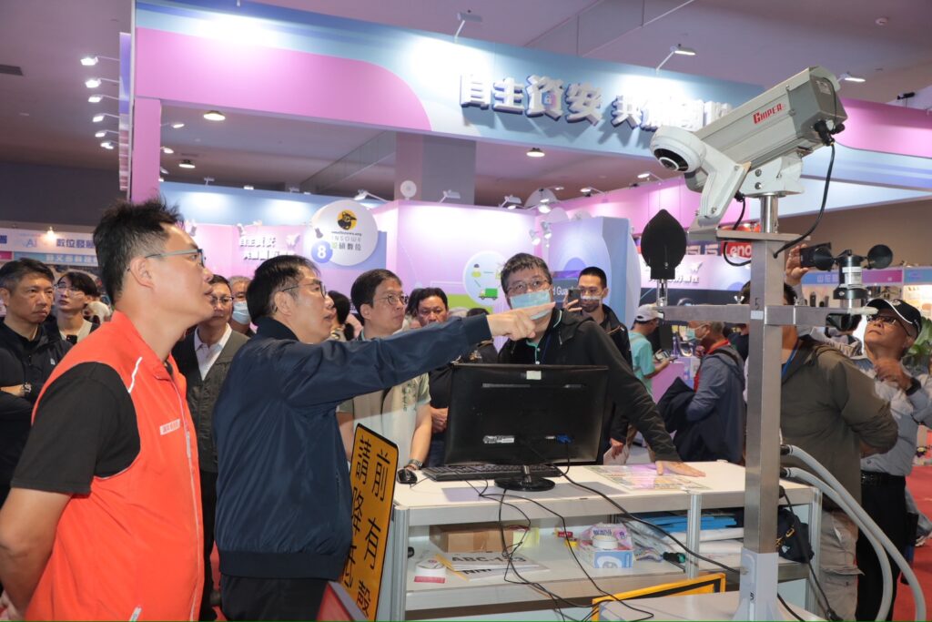 黃偉哲市長在展區了解AI監控與智慧偵測設備應用,並向技術團隊詢問系統功能與實際運作方式。
