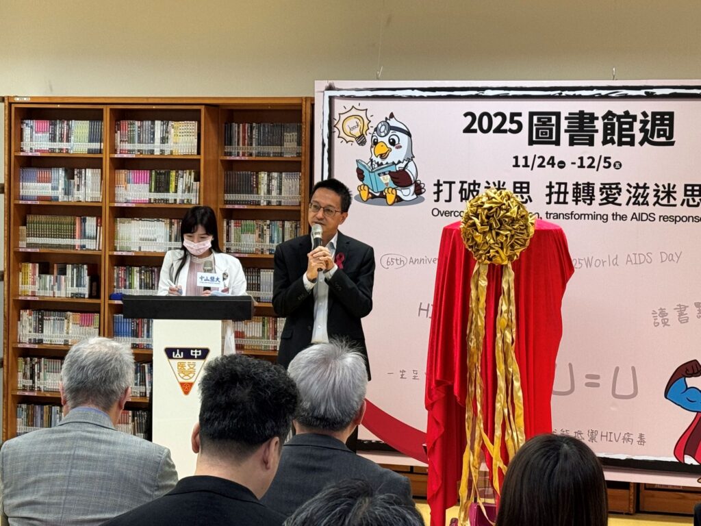 為打破HIV的迷思與標籤,台中中山醫學大學舉辦圖書館週暨世界愛滋病日系列活動,11月25日開幕式,衛生福利部疾病管制署署長羅一鈞、台灣愛滋病護理學會理事長柯乃熒、中華民國台灣懷愛協會主任李夢萍,以及中山醫學大學董事長周英香、中山醫大校長黃建寧、護理系助理教授余嘉惠和懷愛協會理事長、附設醫院感染科主任李原地等人共同出席。