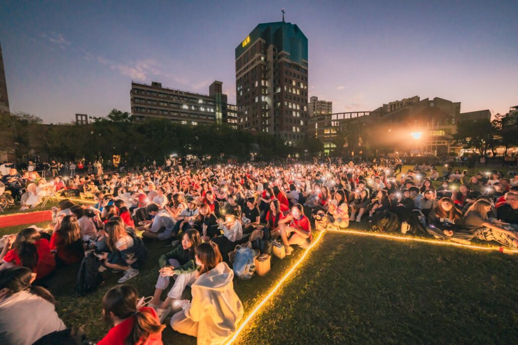 最受矚目的倒數點燈時刻,由師生及校友在場中央排成巨型星星,手中燭火同時燃起傳遞,一旁12米高的巨型聖誕樹也瞬間點亮,場面非常壯觀。今年更首度隔空與澳洲雪梨校友會會長陳韻筑、新加坡校友會會長番珍娟,以及越南校友會會長張勤芝連線,大家一同在線上歡慶,並在倒數計時後,同聲歡呼「文藻60‧生日快樂」,留下珍貴同框的畫面。