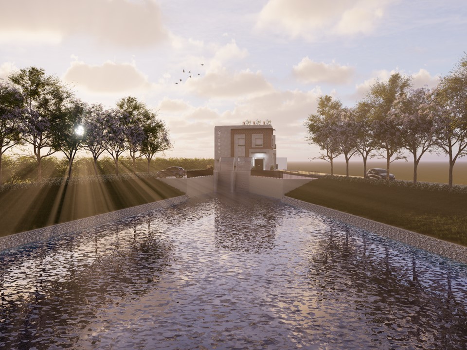 本工程完工後兼具環境友善及親水,透過滯洪池周邊規劃環池步道及綠美化設計,平時提供社區民眾休憩活動空間,需要防汛時則搖身一變守護在地居民免於洪澇,抽水站外觀將採紅磚魚鱗點綴,呼應在地魚塭養殖及過去開墾發展的人文特色,以期未來與社區共榮共好。