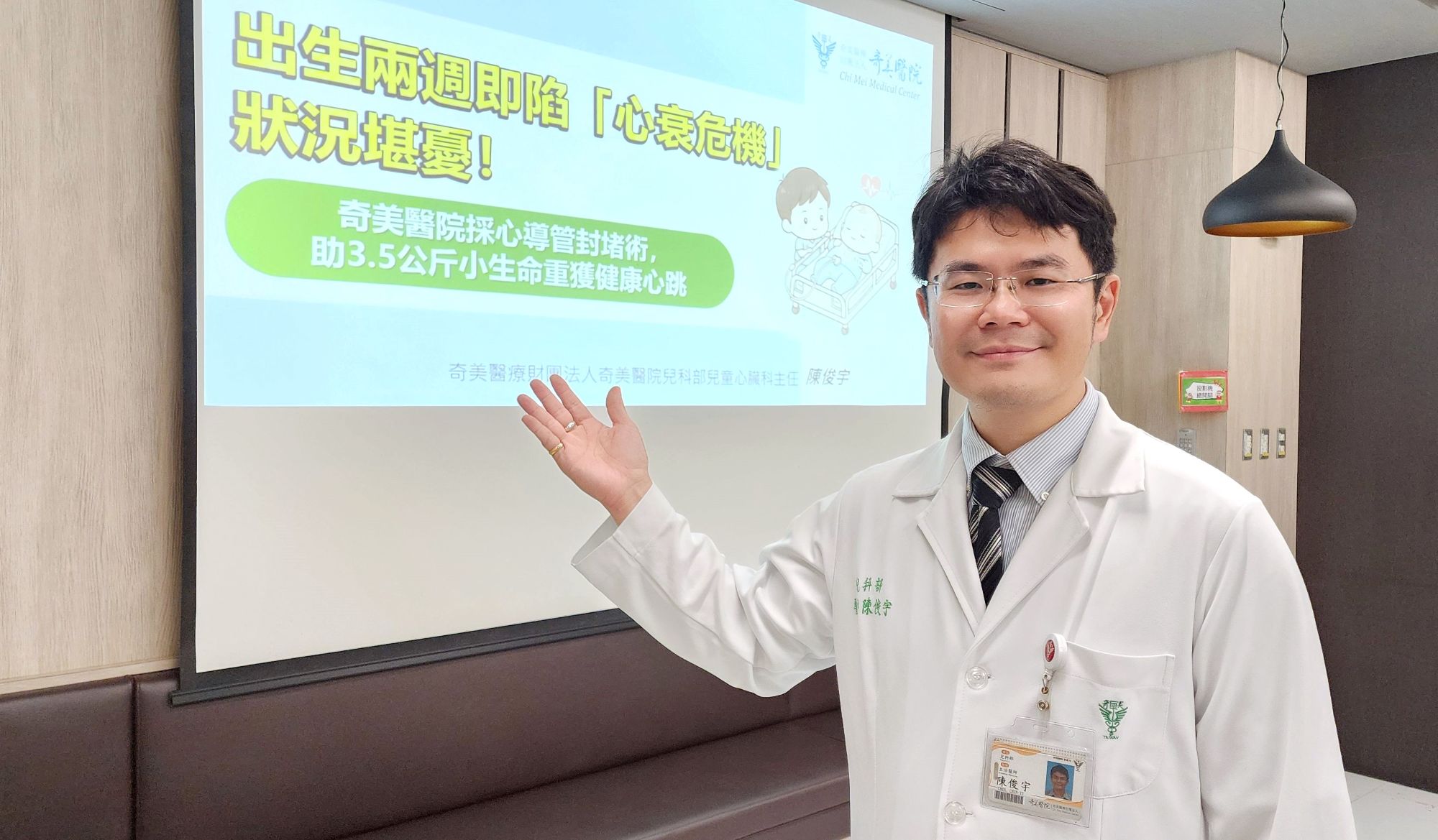奇美醫院兒科部兒童心臟科主任陳俊宇表示,開放性動脈導管(PDA)是一條應該要閉合的血管,屬於先天性心臟病的一種,發生率約千分之一,原本應該在新生兒出生數日內自動閉合的血管若未正常關閉,可能導致急性心臟衰竭、呼吸困難等炎併發症。隨著醫療技術進步,目前已可使用心導管封堵術,以微創的方式取代傳統的「開心手術」,不僅傷口小,且復原時間較快,有效避免日後出現肺動脈高壓或猝死的悲劇。