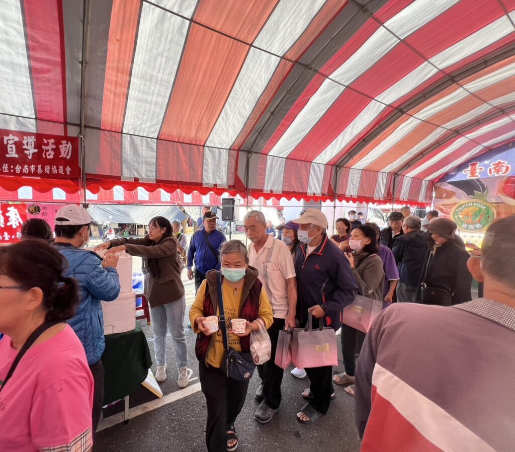 臺南市6日在東區假日農市辦理「國產豬肉品嘗促銷行銷推廣活動」,透過臺南市農會及台南市養豬協進會籌辦,邀集多家在地優良商家到場設攤,並於現場提供品嘗美味豬肉料理以及促銷多元豬肉產品。上午9點多開始就吸引大批民眾到場選購,其中「台南市養豬協進會」發放香腸、鹹豬肉、貢丸湯,及「鮮蒸蝦仁肉圓」發放蝦仁肉圓時段更是大排長龍,人氣爆棚。