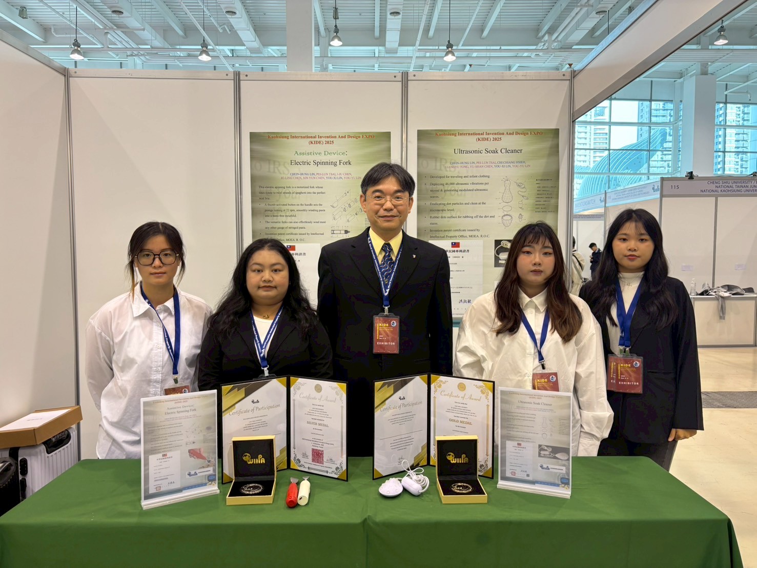 在家用及辦公用品類中,嶺東科大應外系陳鈺姍及幼保系童良喻以作品「懸吊式超音波洗濯器」奪得最高榮譽金牌獎。這項發明瞄準現代人旅遊時的便攜需求,以及嬰幼兒衣物的高標準洗滌要求。從概念發想到實測階段,團隊展現了應外系學生的國際溝通力、跨文化簡報力,以及幼保系學生的產品實用性思考,成功將一項貼近民生的科技創意推向國際。