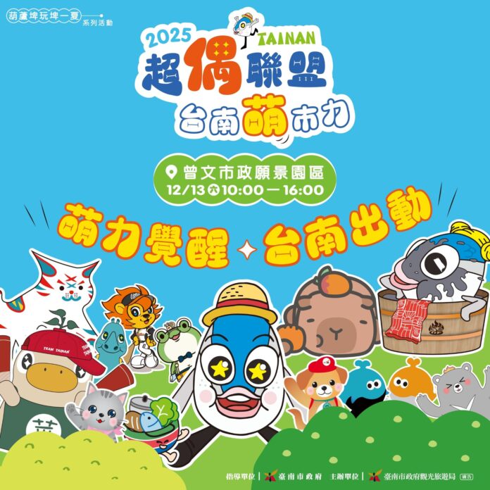 由臺南市政府觀光旅遊局主辦的葫蘆埤玩埤一夏系列活動之一「2025超偶聯盟 臺南萌市力」,將於本周六(13)在臺南市政府曾文市政願景園區歡樂登場!活動當天將集結觀旅局「魚頭君」、西拉雅國家風景區管理處「灰熊熊」、市場處「菜籃仔」、動保處「豆哥」與「凱娣」、體育局「大員」與「甜甜」、左鎮化石園區「KOKO」、臺南市立圖書館「蛙寶」,以及統一獅球團吉祥物「萊恩」等10位可愛的臺南人氣吉祥物,與民眾近距離互動。現場同步展出5座吸睛的大型氣偶,包括泡溫泉的魚頭君、俏皮可愛的菜奇鴨、慵懶療癒的卡比胖拉、帥氣登場的統一獅萊恩,以及魅力爆棚的巷仔Niau,打造超萌拍照打卡景點。此外,還規劃街頭藝人表演、趣味闖關、氣墊遊戲及特色美食市集等豐富內容,邀請大小朋友周末一起到曾文市政願景園區放鬆玩樂。