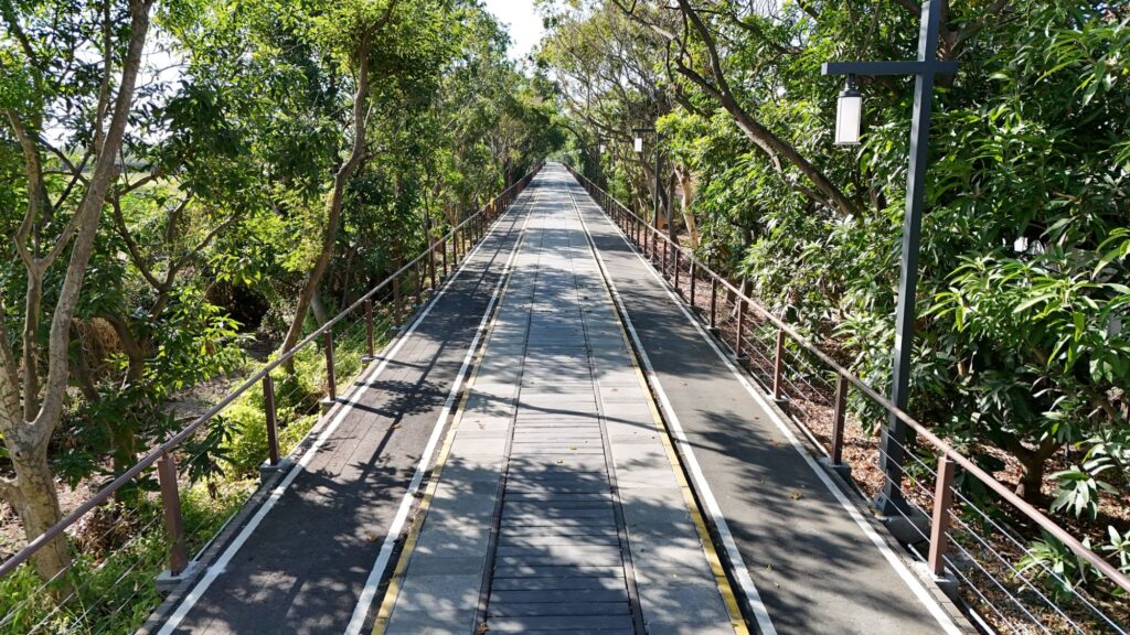 嘉油鐵馬道優化工程近年屢獲肯定,並榮獲2025建築園冶獎-公園綠地景觀類殊榮。本次提升工程延續前期照明理念,採用節能、不眩光、琥珀色溫的照明設計,與周邊綠蔭相互呼應。整體夜間照明以「友善行走、安全視覺、不干擾生態」為原則,營造溫潤柔和的光影層次。工程也落實永續精神,採用低耗能燈具及耐久鋪面,以減量設計降低未來維護與環境衝擊,展現兼具城市再生與環境永續的空間改造成果。