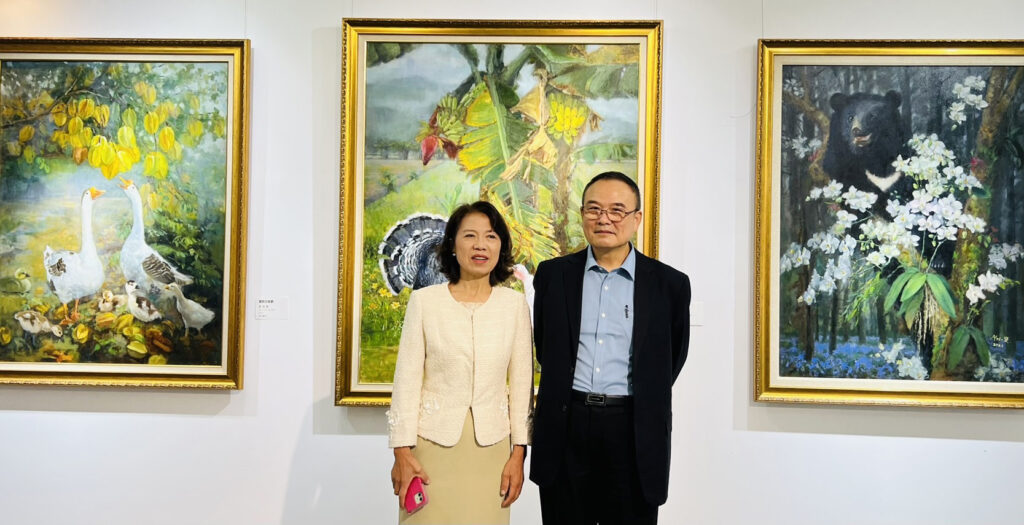故宮博物院蕭宗煌院長(右)參觀黃美賢畫展,稱讚作品具自然美與藝術美。(圖:黃美賢提供)