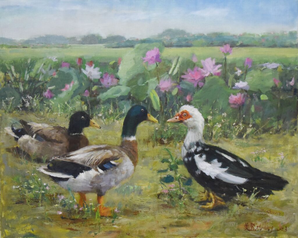黃美賢展出的油畫作品〈鴨戲蓮畔〉。(圖:黃美賢提供)