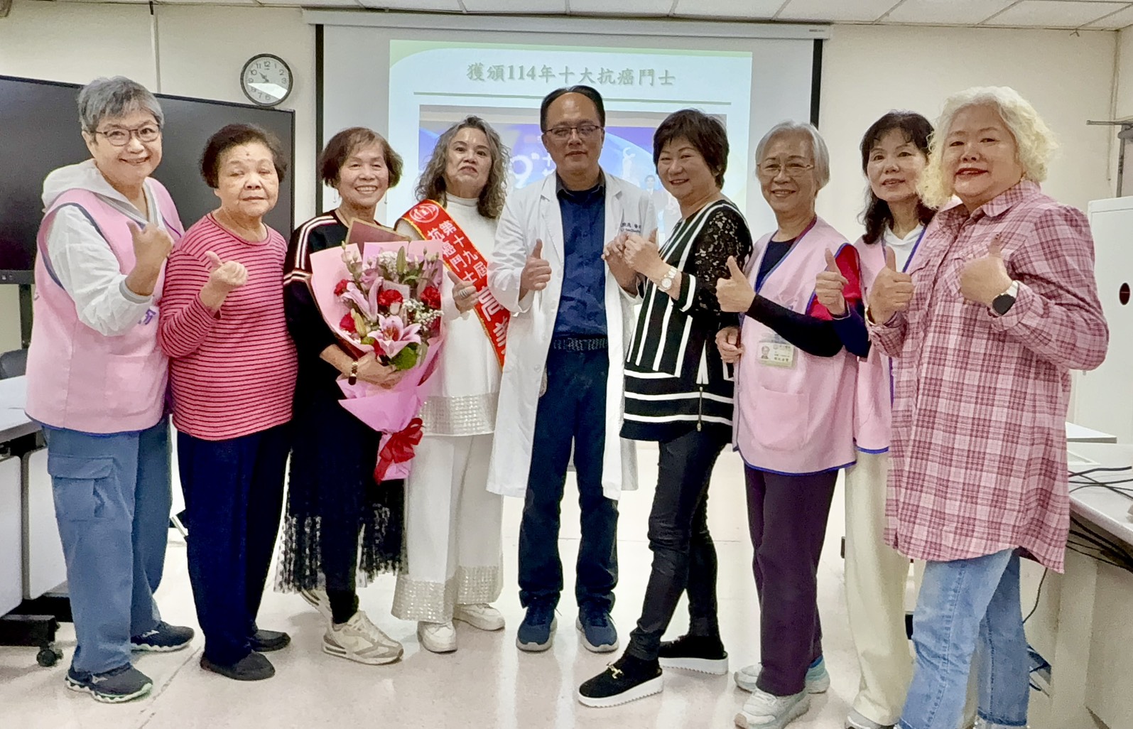 一路上陪她一起抗癌的臺中醫院癌症中心團隊、血液腫瘤科陳駿逸醫師今天特別出席記者會,幫高美鳳姐披上十大抗癌鬥士的彩帶,高美鳳也拿出十大抗癌鬥士的獎章,跟美麗人生乳癌關懷俱樂部姊妹們一起合影分享她得獎的喜悅。