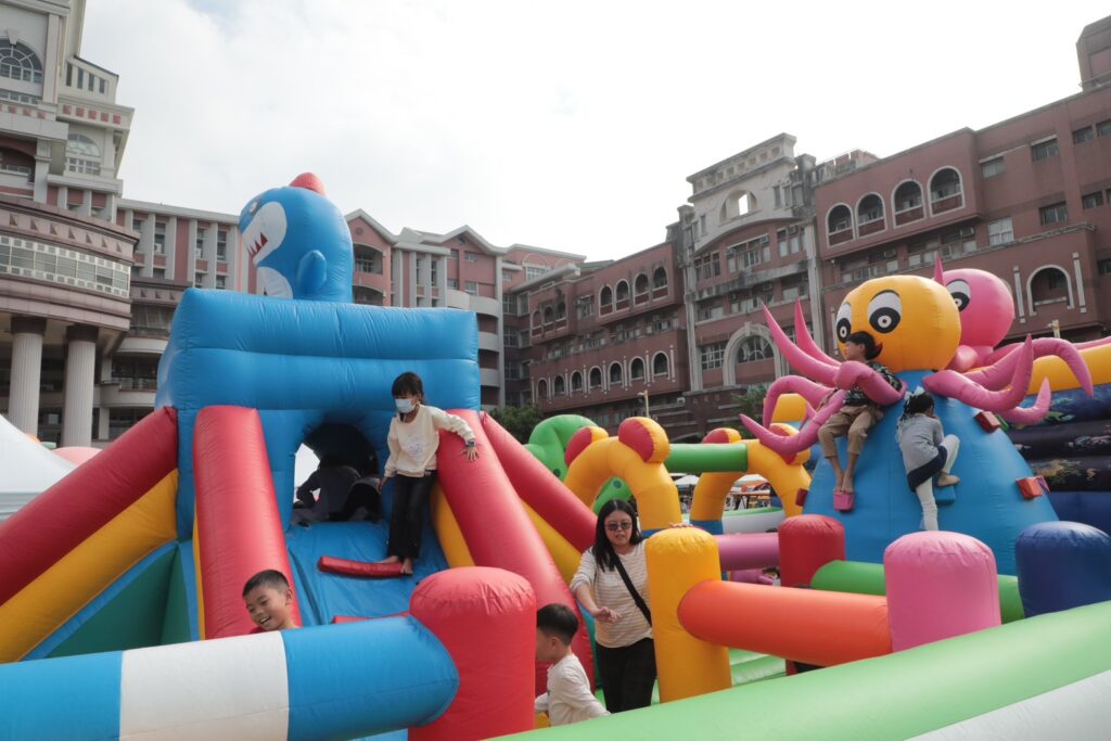 現場設置5座大型氣偶,包括泡湯版魚頭君、菜奇鴨、卡比胖拉、巷仔Niau與元氣萊恩,另備有兩座大型遊戲氣墊,吸引親子排隊放電拍照。