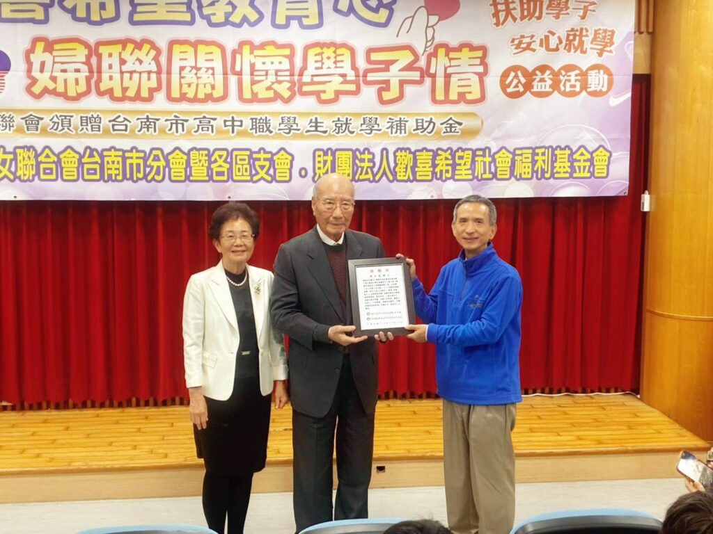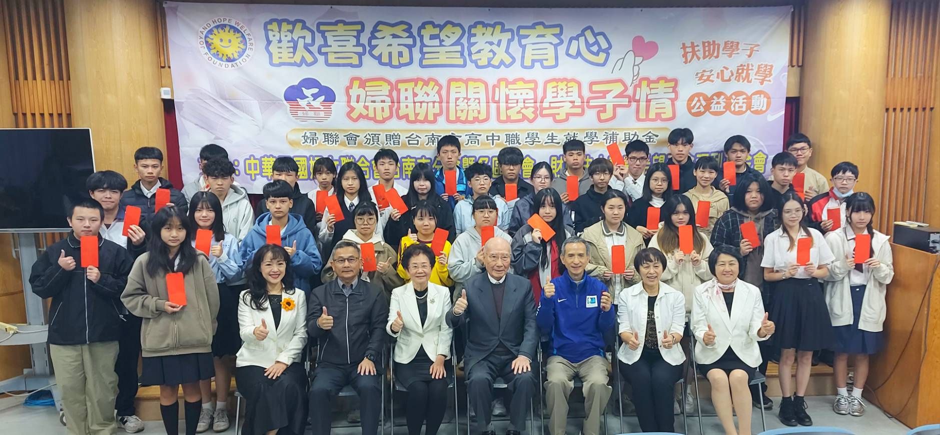 中華民國婦女聯合會與財團法人中華民國婦聯社會福利基金會為協助清寒弱勢家庭的孩子安心努力向學,14日上午假新營高中,頒贈臺南市轄內25校之39名高中職學生就學補助金,每人一萬元。頒贈儀式係由婦聯會臺南市分會與歡喜希望社會福利基金會攜手辦理。歡喜希望社會福利基金會則捐款五萬元給新營高中「教育儲蓄專戶」,共同為扶助弱勢學生,確保安心就學略盡綿薄。