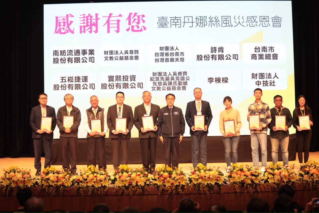 台南市政府感恩會邀請多個單位代表上台受獎,肯定企業、宗教團體與民間力量在災後復原中的關鍵角色。