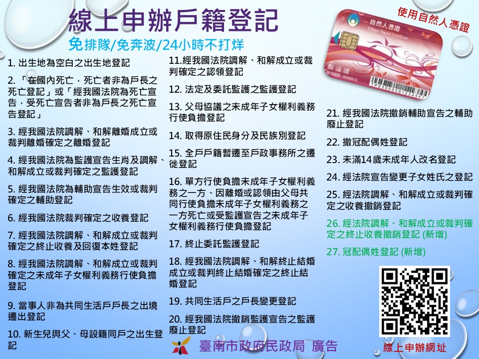 為提供市民更彈性、更便利的戶政服務,臺南市政府配合內政部持續擴大「線上申辦戶籍登記服務」(https://www.ris.gov.tw/app/portal/885),新增「冠配偶姓登記」及「經法院調解、和解成立或裁判確定之終止收養撤銷登記」2項服務,自114年12月1日起,民眾可持自然人憑證於網路提出申請,24小時皆可完成登記作業,不受時段限制。