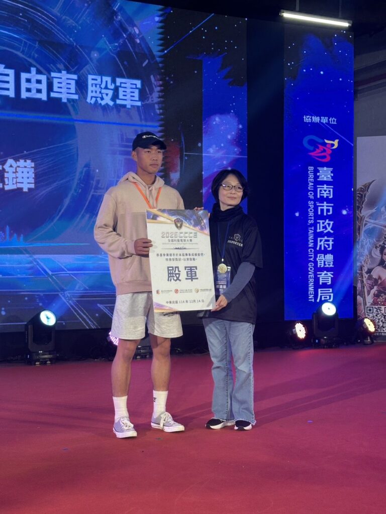 臺南市電競委員會主委副主委朱正軒進一步指出,看到南英商工的一年級新生初試啼聲,便能在全國舞台上展現大將之風,這不僅展現了「傳承」的意義,更證明了學校在實務教學上的扎實功力。他強調,現在的電競產業鏈已高度結合 AI 運算、數位影音與虛擬實境技術,南英學子在「虛擬自行車」與「賽事實況轉播」的雙重佳績,正是符合未來數位科技趨勢的最佳體現。他期許這些年輕選手能持續精進,善用台南豐富的電競教育資源,未來不僅是台南的光榮,更能成為台灣數位內容產業的中流砥柱。
