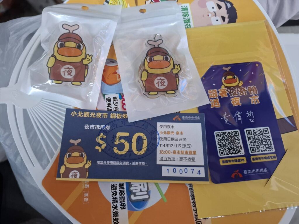 12月19日 (週五) 晚間,臺南市夜市超高人氣吉祥物「夜奇鴨」,走進小北商場 (小北觀光夜市),辦理「夜奇鴨」見面會,現場民眾合照打卡即送周邊小飾品;同時市府為提升夜市經濟,現場發放夜市銅板抵用券,小北商場發展協會更加碼支持,在聖誕節前夕,向民眾傳播歡樂,推廣享受夜市美食及歡喜購物。