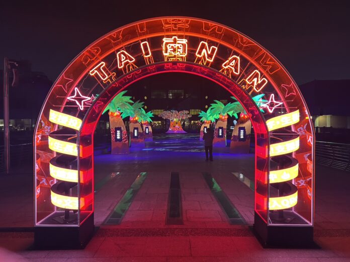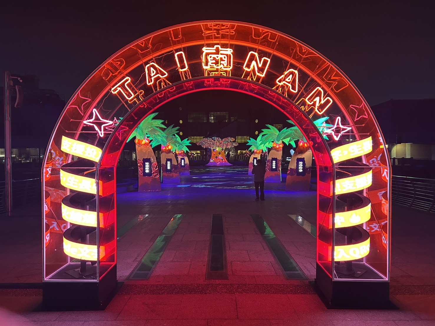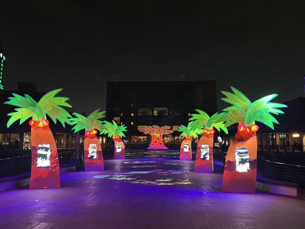 《Reborn:南火之誕》以「臺南的日常」為策展起點,從入口拱門開始,閃爍著由臺南傳統氖氣霓虹老師傅親手打造的霓虹燈線,彷彿引領觀眾走進城市的時光隧道,開啟一段屬於臺南的故事。沿著椰林大道前行,高聳並立的椰樹象徵城市的支柱,回應日本時代因仿羅馬列柱而種植椰樹的都市規劃,見證臺南在殖民記憶與現代發展之間的交錯。作品以《椰誕》為名,讓椰林大道在聖誕節慶中被重新喚醒,人們在樹下交換祝福,使文化記憶在光影中持續流轉。