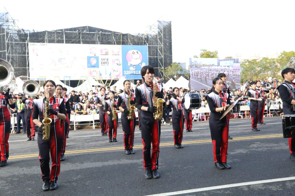 今年踩街嘉年華共集結7支國際團隊與48支國內優秀團隊。首先,由嘉義女中樂旗儀隊領軍,整齊劃一的步伐與旗舞率先點燃現場氣氛,接續嘉義市南興國中、嘉義大學、東吳高職等多所學校團隊輪番上陣,學生們在樂聲中展現自信與活力,充分呈現嘉義多年來深耕音樂教育的成果。