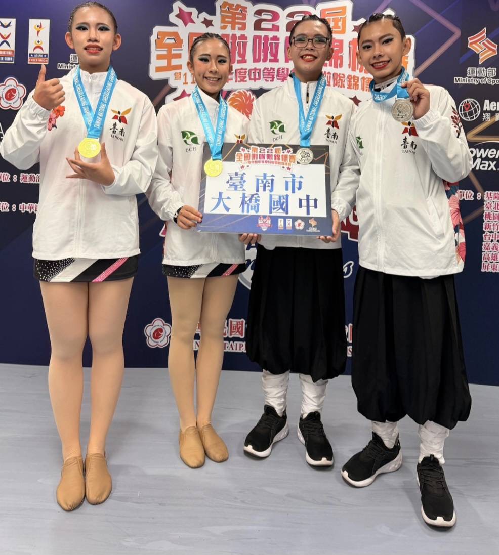 臺南市大橋國中啦啦隊在「2025年第22屆全國啦啦隊錦標賽」中表現亮眼,勇奪多項佳績!由黃才氤、蘇靖雅同學組成的「彩球雙人國中組」摘下金牌,曾郅恩、陳昱佑同學則在「嘻哈雙人國中男生組」勇奪銀牌;此外,在團體賽「彩球指定動作國中組」中,大橋國中A隊以穩健動作與完美默契奪下冠軍,B隊榮獲殿軍,同時,大橋國中更以精湛的整體表現勇奪「彩球團體國中組」冠軍。全體選手展現自信、熱力與團隊精神,為學校及臺南爭光。