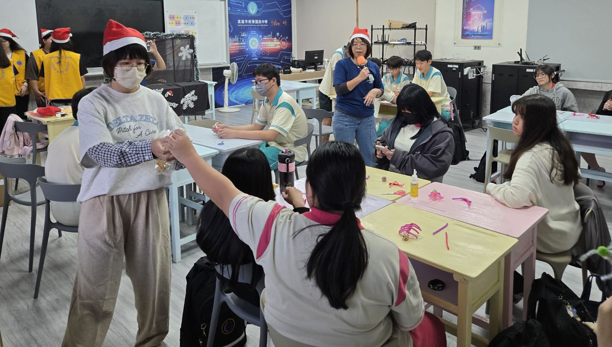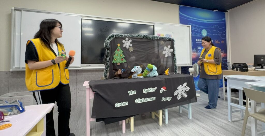 隨後團隊前往蚵寮國中,展開結合英語、戲劇與環保理念的「Green Xmas」主題活動。文藻USR團隊帶領學生完成「創意糖果蜘蛛」手作,並演出原創英語手偶劇《The Spider’s Green Xmas Party》,透過森林動物用環境友善方式準備聖誕禮物的故事情節,傳遞減廢、再生與關懷他人的永續精神。活動最後,全體學生手持自製手偶,一同合唱聖誕歌曲,現場氣氛溫馨。