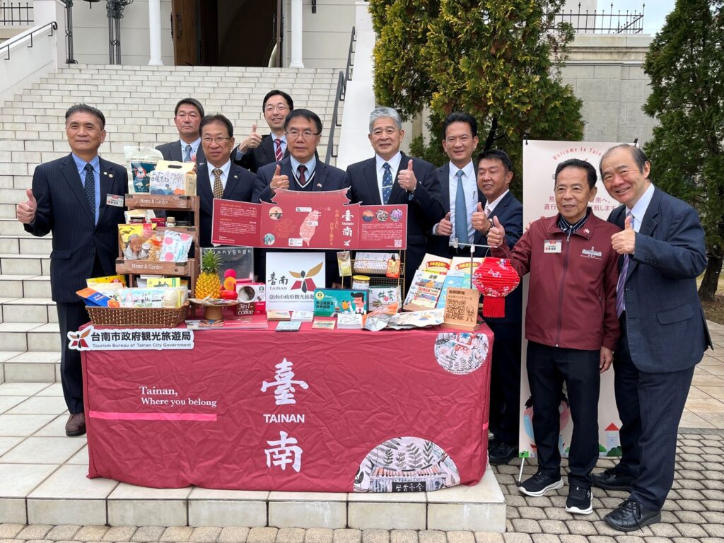 觀光旅遊局表示,市府出訪團於12月23日共同搭乘臺南熊本直航首航航班前往日本熊本,12月24日上午拜訪熊本市經濟觀光局並由觀光交流部大石雄一部長率員接待交流。隨後由黃偉哲市長率隊參加臺灣虎航舉辦之熊本航線首航紀念午宴,與熊本縣知事木村敬及地方政府代表、航空業者、觀光相關單位及媒體進行交流。本次虎航午宴特別邀請臺南知名辦桌業者阿勇家操刀,呈現具代表性的臺南辦桌料理,透過飲食文化展現臺南的城市特色與美食魅力。為加強臺南觀光品牌行銷,午宴活動現場同步設置臺南觀光物產展桌,展示多款臺南觀光手冊、地圖及旅遊文宣,內容涵蓋各種主題,包含國際觀光客專屬3天2夜推薦遊程、特色區域散步導覽、美食觀光、溫泉、教育旅行等,並提供市內觀光公車等交通資訊,搭配特色物產介紹,透過形象布置與推廣素材,向與會貴賓及當地民眾完整呈現臺南多元豐富的旅遊樣貌。觀光產業代表後接續拜會菊陽町役場,就觀光推廣及旅遊交流等議題進行意見交換。