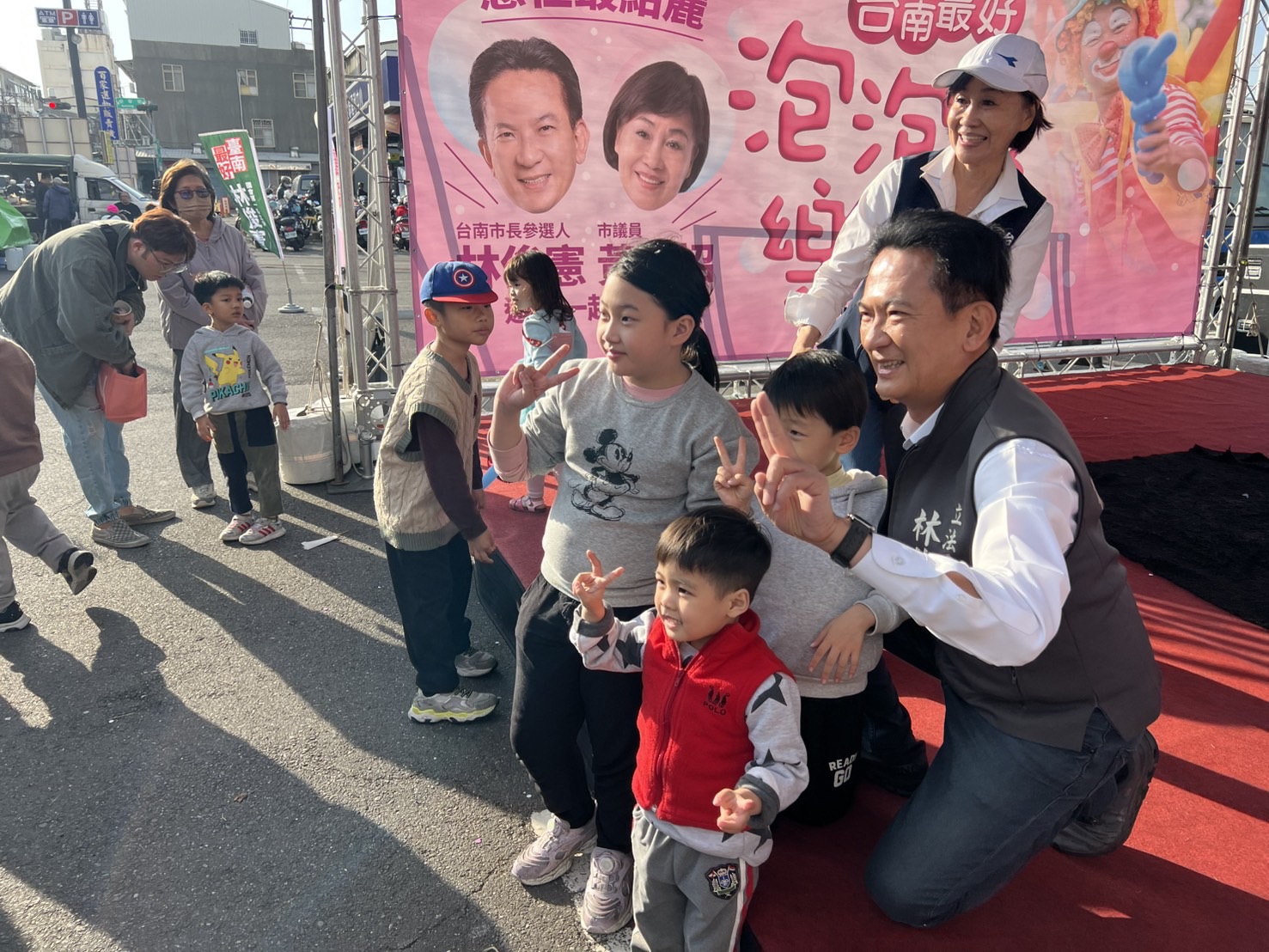 下午,林俊憲轉往安南區,與市議員黃麗招共同合辦親子同樂活動,現場安排魔術泡泡秀等親子互動表演,吸引許多家長攜帶孩子踴躍參與。林俊憲親切與大小朋友互動、合影,展現親民形象,也讓不少家長直呼「很接地氣」,活動現場充滿歡笑聲與聖誕節氣氛。