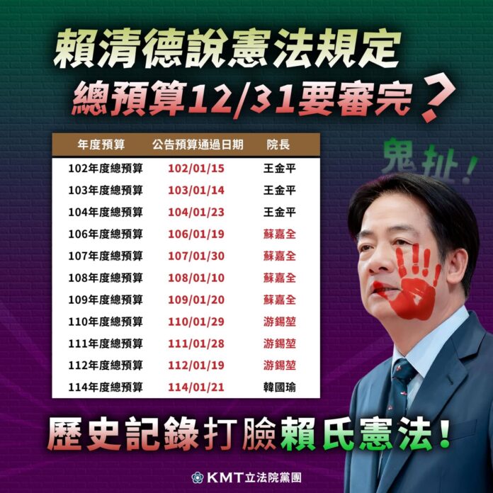 針對賴清德說憲法規定總預算12/31要審完說法,國民黨立院黨團提出歷史記錄打臉賴總統。國民黨指出,總統賴清德煞有其事地宣稱憲法明文規定總預算必須在12/31前完成審議。這一點不禁讓全國人民奇怪了,過去總預算不曾有此規定,全台灣人民讀的是《中華民國憲法》,難道賴清德打算「賴皇制憲」,以後立法院由少數黨的民進黨說的算?