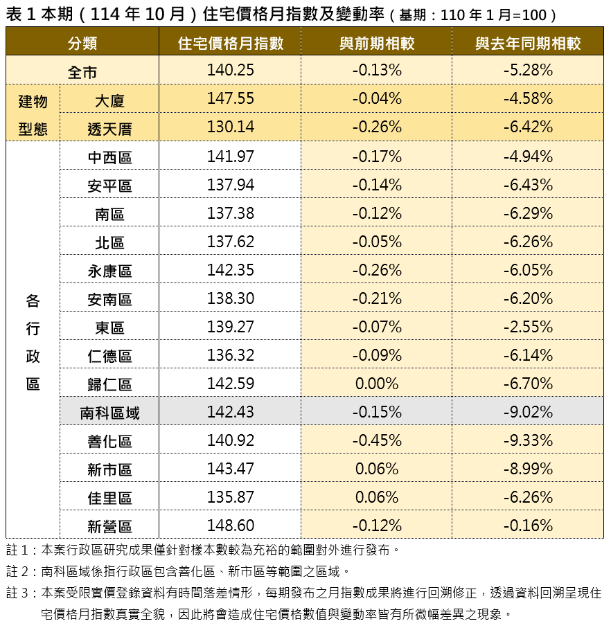 114年10月臺南市住宅價格指數為140.25,較前期(9月)微幅下降0.13%,相較去年同期則小幅下降5.28%。以住宅型態而言,本期大廈的價格指數為147.55,透天住宅的價格指數為130.14,與前期相較,大廈價格指數微幅下降0.04%,透天住宅價格指數微幅下降0.26%。觀察各行政區本期住宅價格指數,多數行政區相較前期及去年同期呈現微幅下修格局。在交易量方面,本期全市交易量較前期微幅增加2.69%,觀察各行政區交易量各有增減,並以佳里區的交易量增幅96.43%最為顯著,而仁德區的交易量增幅以69.05%居次。