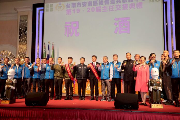台南市後備憲兵荷松協會安南區聯絡中心28日於富霖宴會餐廳舉行第19、20屆新舊任主任交接典禮暨歲末感恩聯誼餐會,席開近百桌,場面隆重溫馨。市長黃偉哲親自出席見證交接儀式,並偕同民政局副局長吳明熙及10多位將軍蒞臨祝賀,表達對後備憲兵弟兄的肯定與感謝。