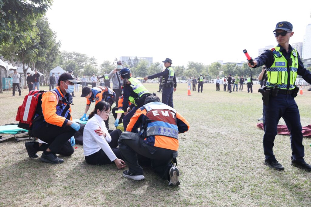 市府警察局說明,本次演練情境設定在模擬跨年活動現場演唱會進行中,發現歹徒預藏煙霧彈在場中丟擲並隨機傷人,引發群眾騷動情況,現場執勤員警發現突發事件後,立即圈圍歹徒、控制現場,並由特殊任務警力持辣椒水、臂盾及電擊槍等制伏行兇歹徒,隨即由相關單位啟動疏散民眾、救護傷患、通報後送責任醫院及周遭路口號誌燈控等機制,整合各單位即時反應機制,強化突發事故應變處置能力。