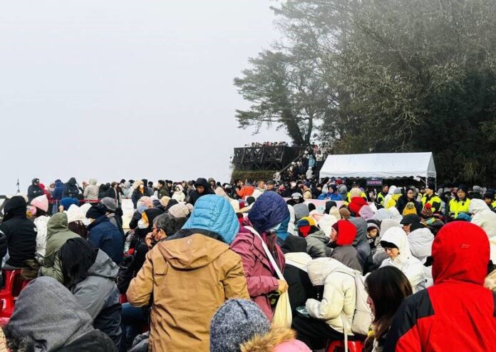 小笠原山觀景台、對高岳觀日坪也湧入上千人卡位,架起攝影機等待迎接日出,期待見證新年的第一道曙光,但直到天色大亮,因大霧都沒有曙光蹤影,連遠山輪廓都看不清楚,遊客等到7時失望地陸續下山。