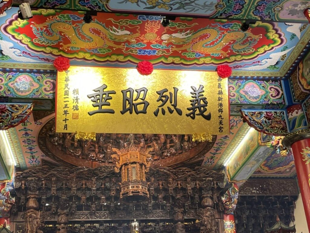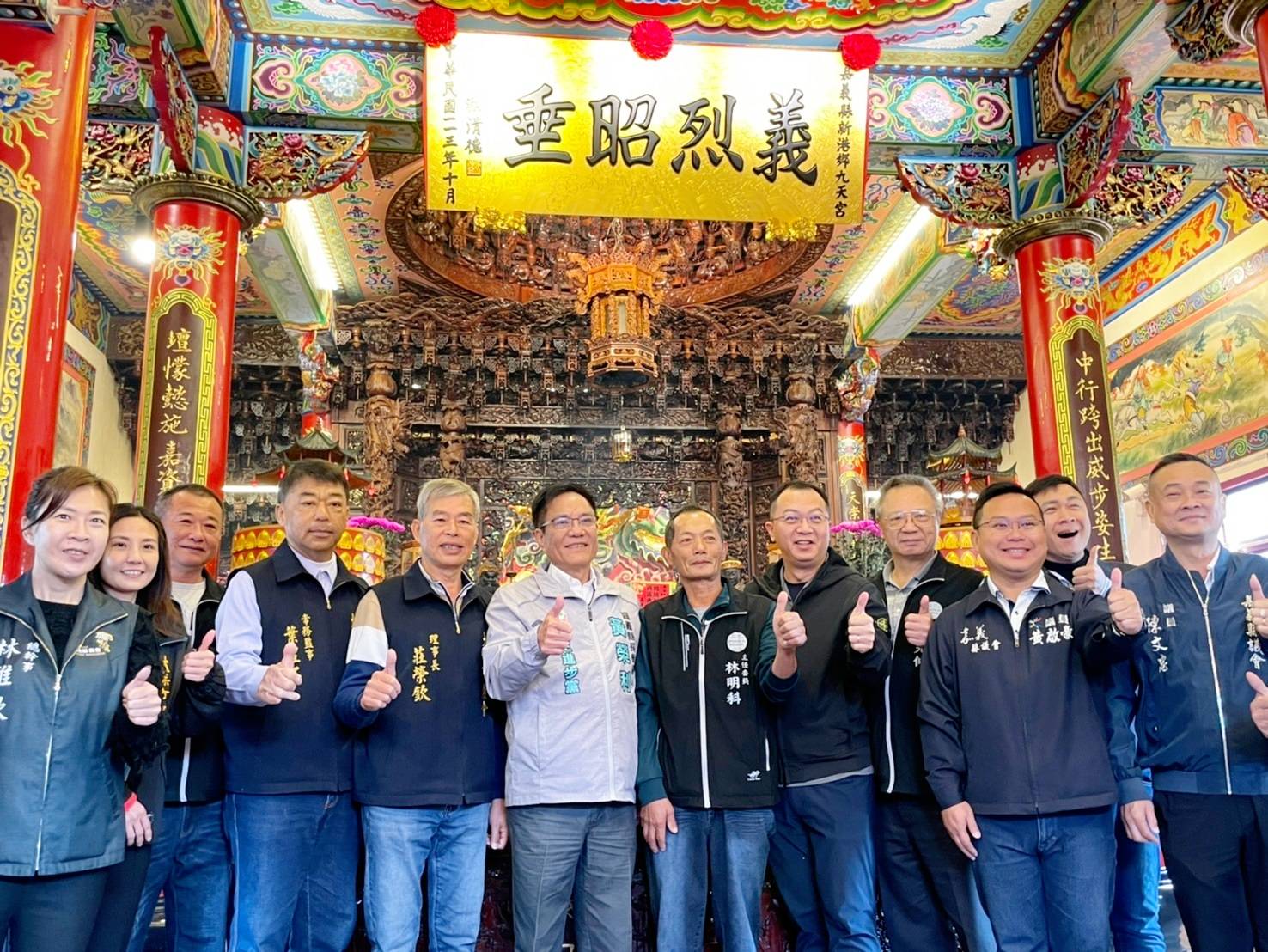 九天宮特擇4日良辰吉時,舉行揭匾典禮,並邀請黃榮利代表賴清德總統揭匾,吸引眾多信眾到場參與。黃榮利在九天宮主任委員林明科、副主任委員王見仲、常務監事林長佳、新港鄉長葉孟龍、陳文忠議員、黃啟豪議員、林秀琴議員、新港鄉民代表會林國富副主席、新港鄉農會張秀安理事長、林雅欣總幹事、太保市農會莊榮欽理事長、葉豊仁常務監事、黃靜玉總幹事、新港鄉月眉村長林明泰及多位地方賢達陪同下,上香祈福,向關聖帝君致敬。過程中,黃榮利也受到地方鄉親熱烈支持與鼓勵,展現基層對黃榮利參選嘉義縣長的高度期待。