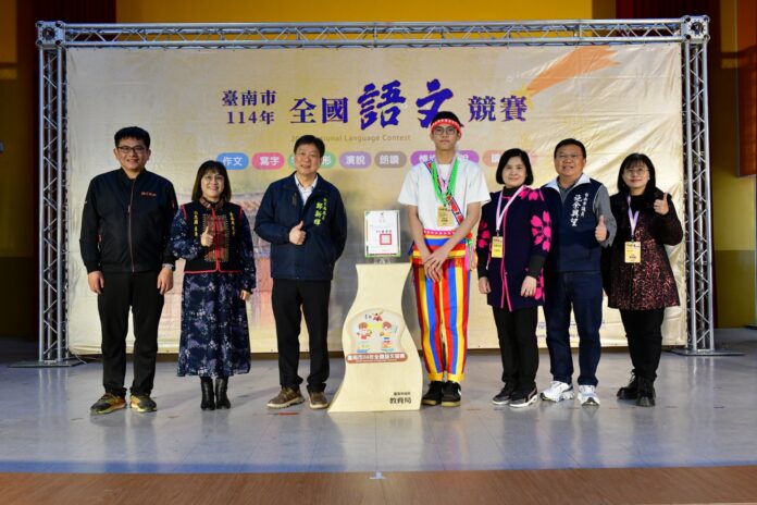 臺南市177位選手參加114年全國語文競賽,不負眾望,在各縣市群雄中於個人賽獲特優28位、優等91位、甲等26位;團體賽讀者劇場特優5隊、優等3隊佳績為六都第一,教育局於1月7日在大成國小舉辦頒獎典禮,教育局長鄭新輝代表市長黃偉哲表揚代表隊選手及教師,肯定學子努力與指導老師用心培育。南市原民會主委白惠蘭、客委會主委陳新裕,及議員Ingay Tali穎艾達利、施余興望Tjakumay Tagaw均到場觀禮。