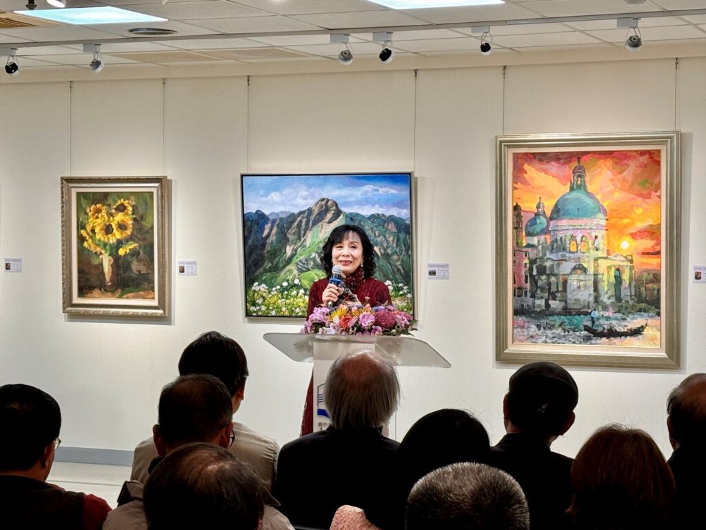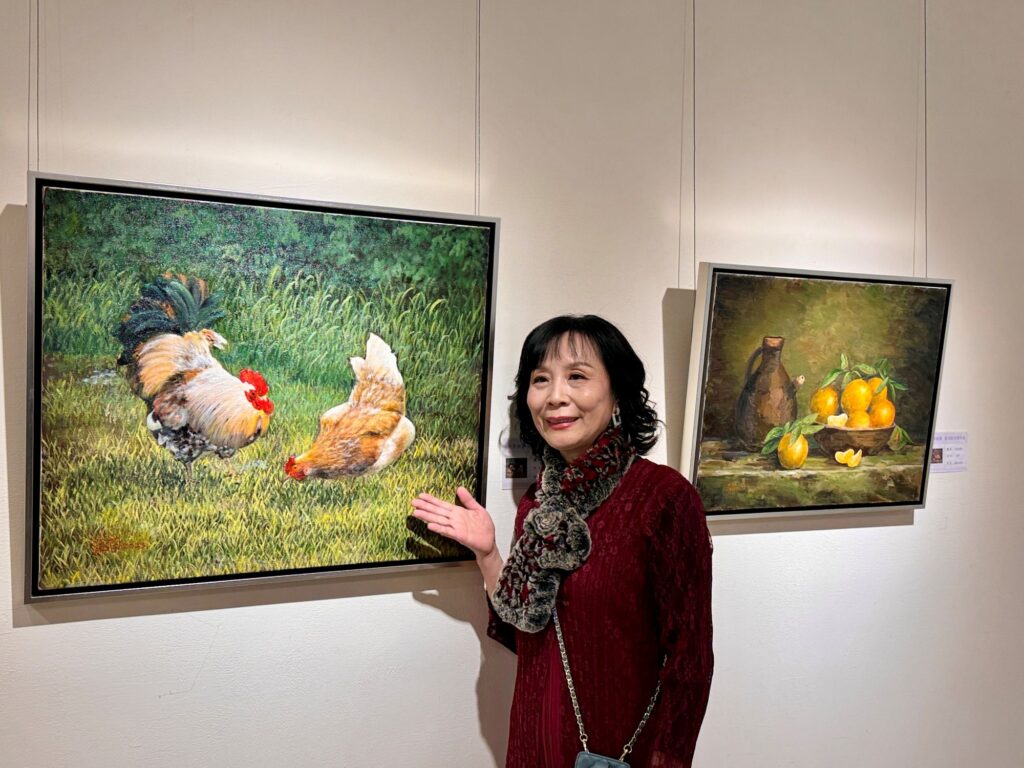 策展人也是她的油畫老師方鎮洋在開幕式,對廖涵茵相夫教子且要帶孫子之餘,還能創作這麼多好作品,誇讚不已。他說,廖涵茵很聰明,教畫的過程才講一半,她就知道了,對於美學的概念及繪畫表現技法的學習,吸收很快,短短時間就能開油畫個展,實在很不簡單。